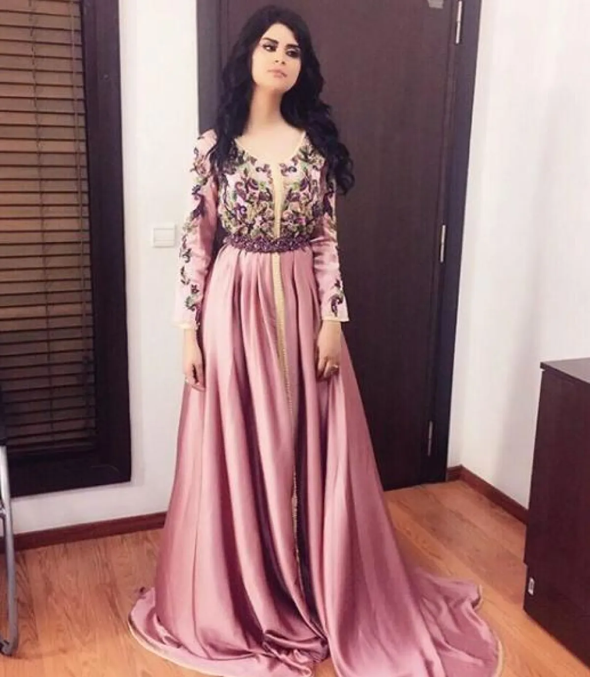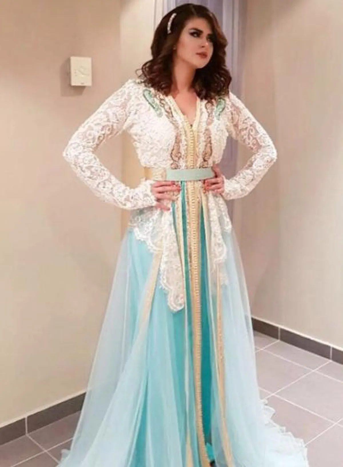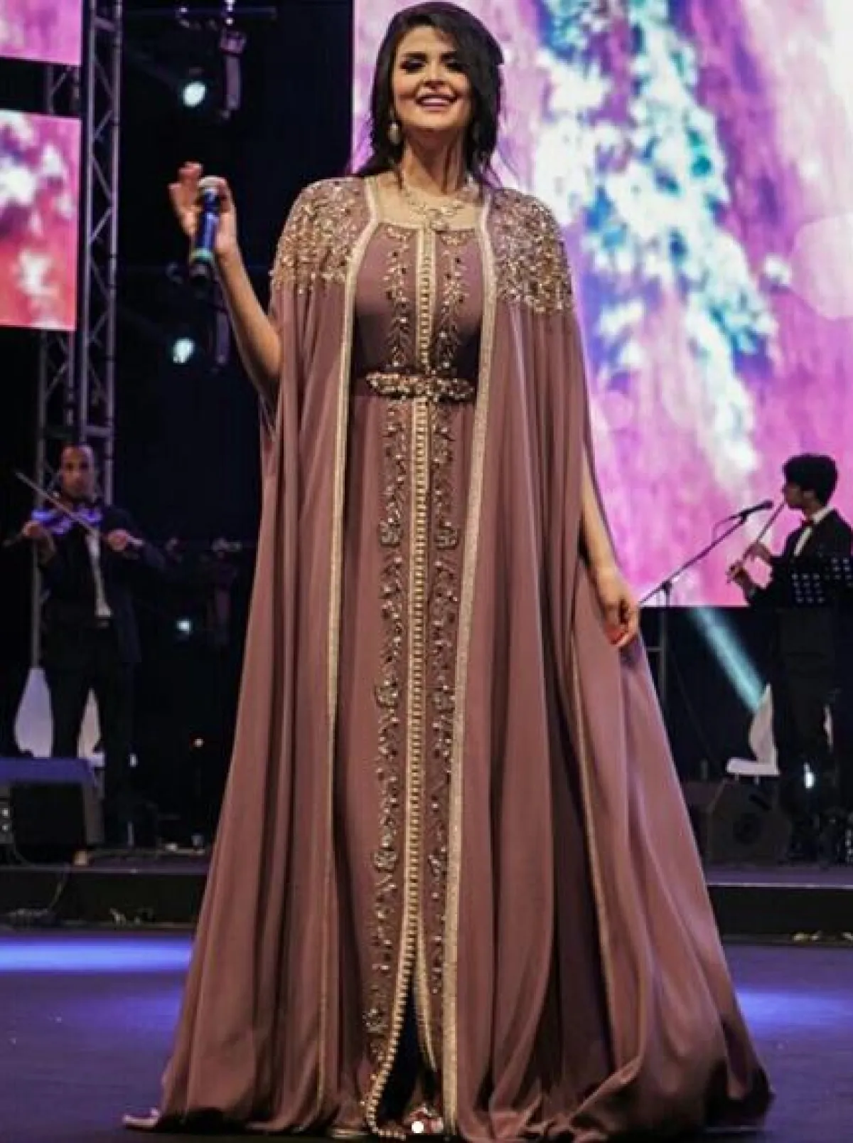على المسرح اختارت سلمى رشيد قفطانًا ذا تصميم فاخر، له رداء طويل زاده فخامة، ونسقت معه مجوهرات ذهبية بارزة.