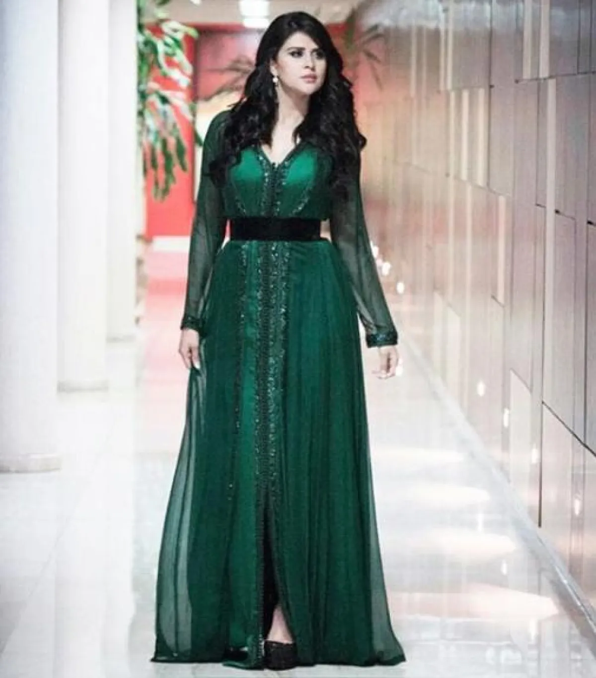 اطلالة أنيقة اعتمدتها سلمى رشيد في قفطان باللون الزيتي من قماش الشيفون، وقد زينت خصرها في هذا اللوك، بحزام عريض باللون الأسود، واختارت أقراطًا ناعمة.