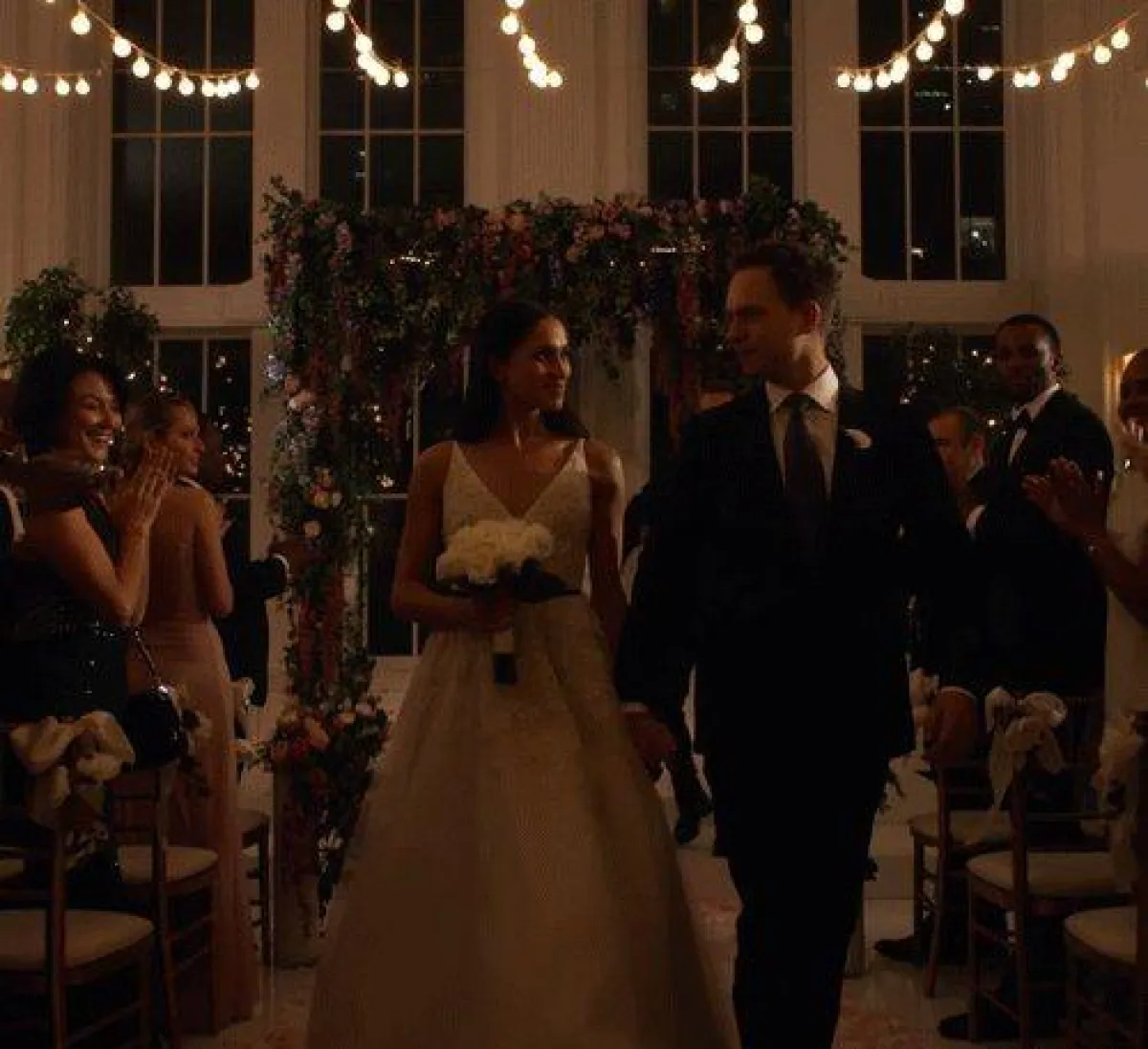 وشاهد متابعو المسلسل ميغان، أو ريتشل، وهي تسير في ممر الكنيسة في فستان مطرز بلا أكمام وحول خصرها حزام أسود، قبل أن تقول للعريس: "أنت الرجل الذي طالما أردت الزواج به. لا أطيق الانتظار في أن نبدأ مغامرتنا معاً".