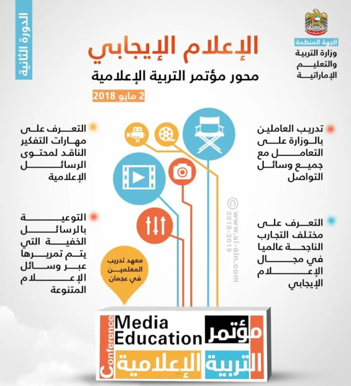 تنطلق غداً 2 -5- 2018 فعاليات مؤتمر التربية الإعلامية تحت عنوان «الإعلام الإيجابي بين التطلعات والتحديات» في معهد تدريب المعلمين – عجمان، وذلك إيماناً بالدور المهم الذي تُحدثه التربية الإعلامية في المجتمع، إذ أن التربية الإعلامية صانعة فكرِ الإنسان وسلوكه، وللإعلام الإيجابي أثر في نفوس وعقول أبناء المجتمع وهو داعم في بناء الشخصية الإيجابية المنتمية للوطن.