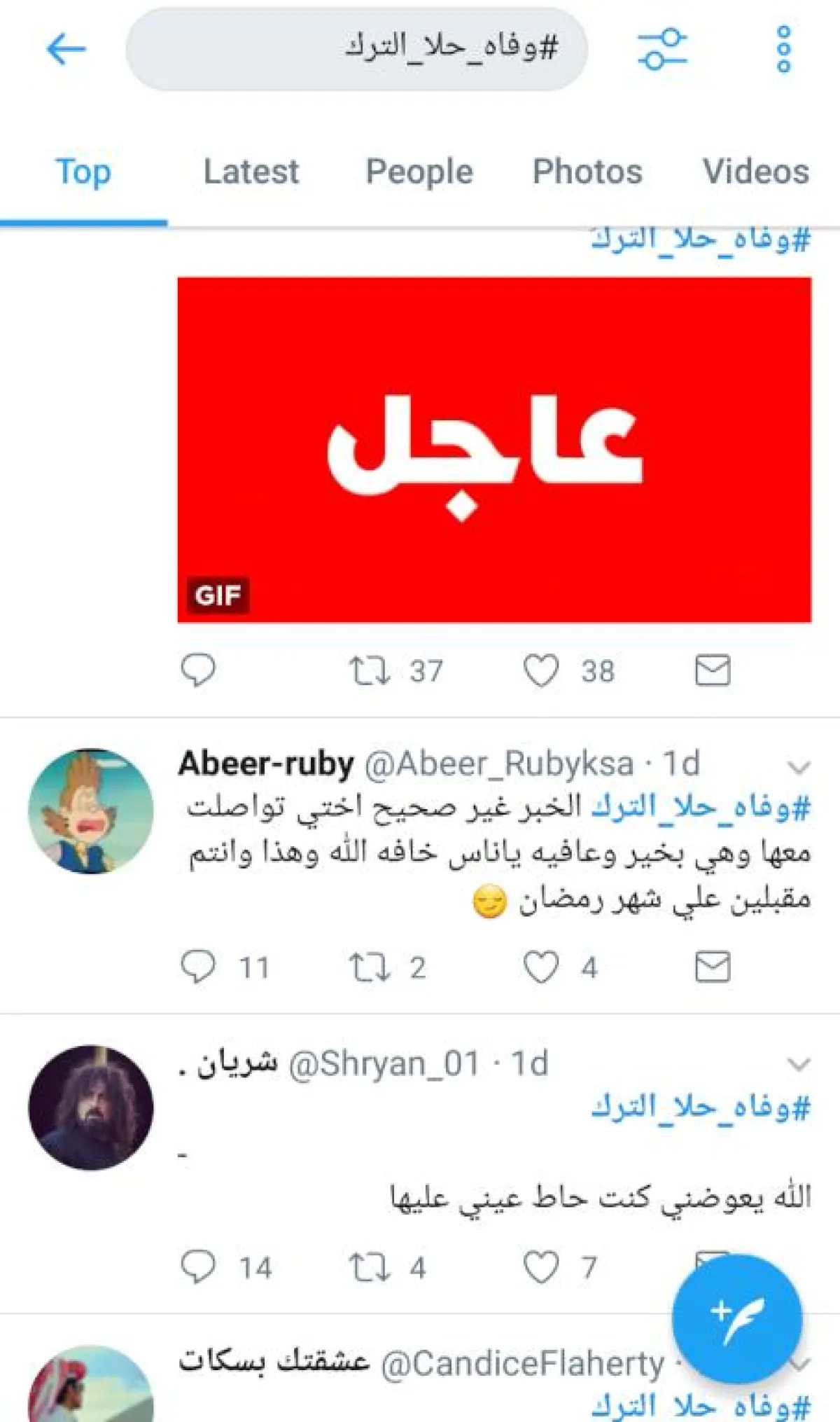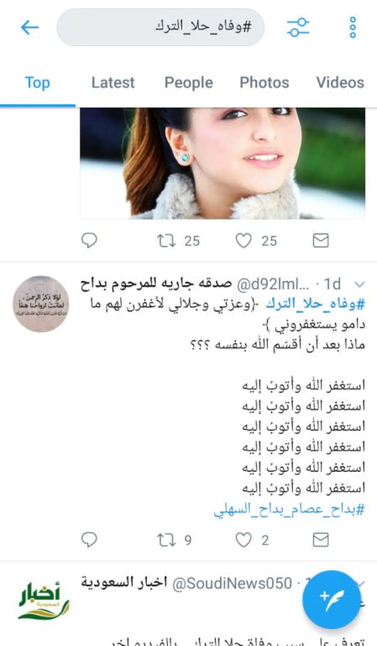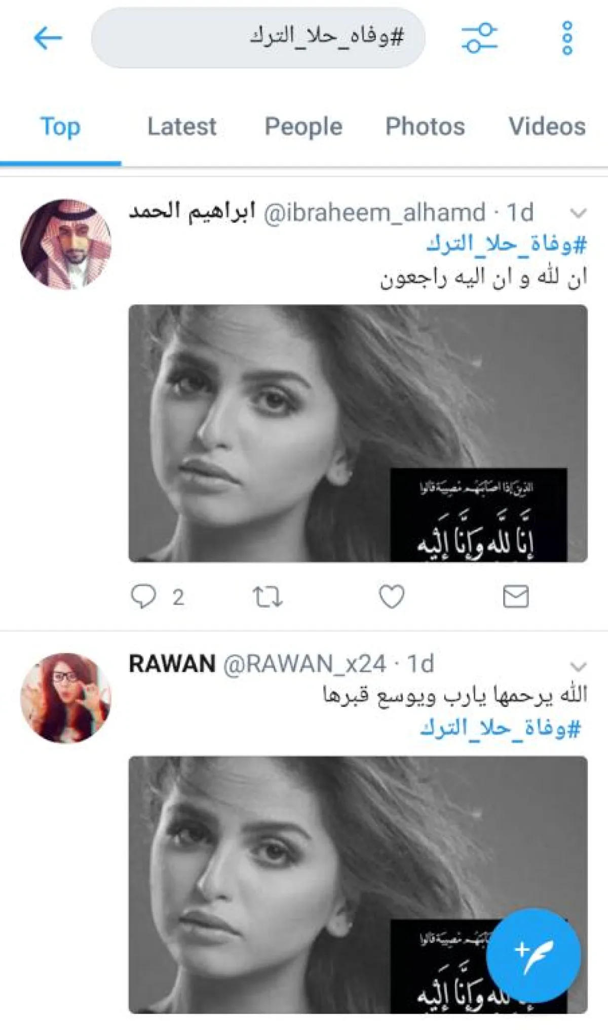 قبل يومين، انتشر هاشتاغ "وفاة حلا الترك" على "تويتر" ما أثار بلبلة كبيرة بين رواد مواقع التواصل الإجتماعي، خصوصاً أن الهاشتاغ أصبج تراند قبل أن يغرّد عليه احد، ما يثبت أنّه مدفوع الثمن لأهداف دعائية لم يعرف من يقف وراءها.