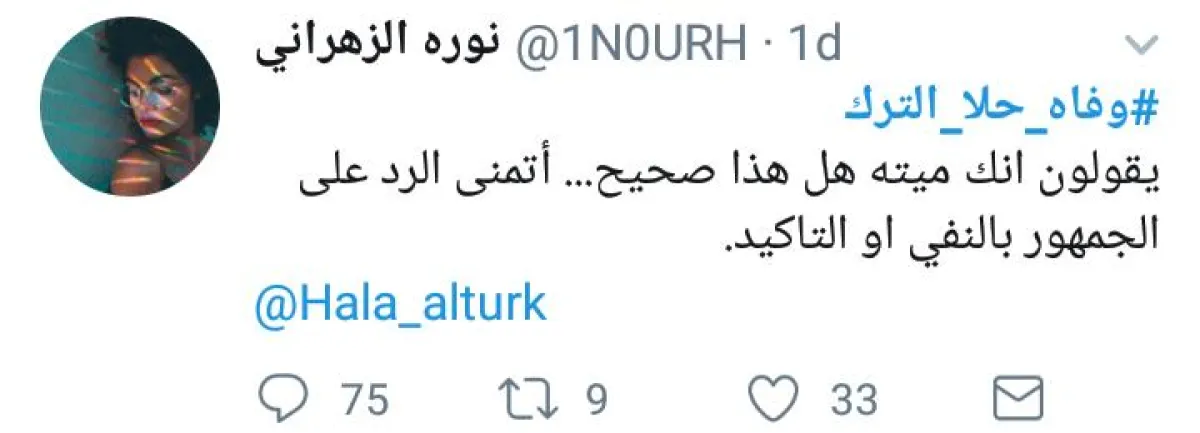 فهل تقف حلا الترك وراء هذه البلبلة ليتم تداول إسمها ويصبح خبر موتها "ترند" خصوصاً وأنها المستفيد الوحيد من وراء إنتشار الخبر، علماً أن حلا الترك إختفت عن مواقع التواصل الإجتماعي بشكل يدعو إلى الإستغراب، فهي غائبة عن فايسبوك منذ 28 نيسان\ أيريل الماضي ولم تغرد على "تويتر" منذ 27 الماضي، كما أنها لم تطل على "إنستقرام منذ يومين، أما آخر إطلالاتها على "سناب شات" فكان يوم السبت الماضي عندما شكرت الفنانة أحلام لاختيارها للمشترك البحريني فيصل الانصاري في برنامج "ذا فويس".