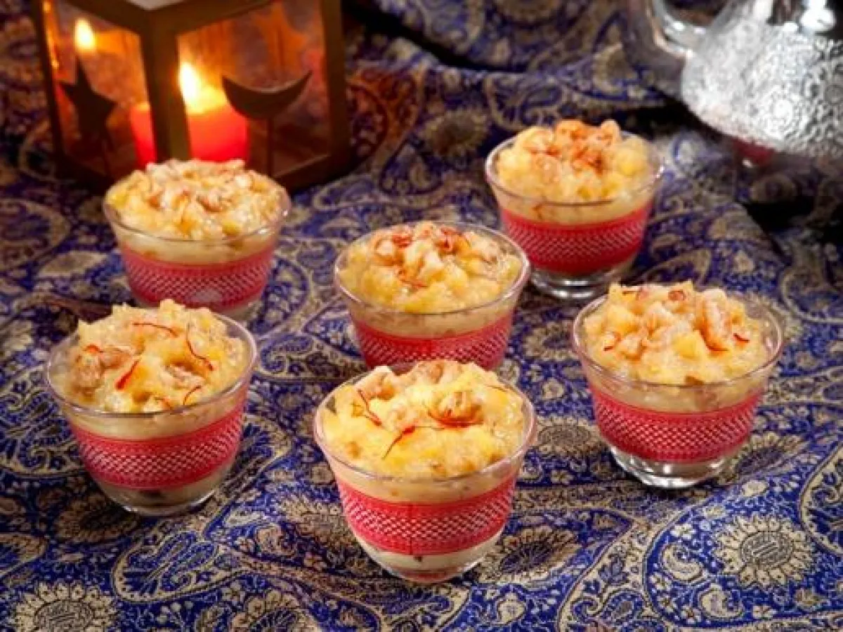 7-إسكبي عصيدة الدبس ساخنة في الأطباق. وزعي الفستق . قدمي عصيدة الدبس ساخنة او حسب الرغبة.