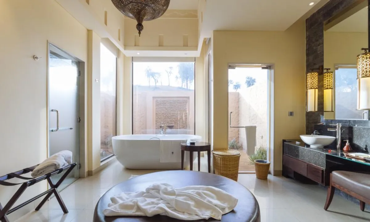 5. حوض الاستحمام، سواء كان مستطيل الشكل أو دائريًّا، تتبعه اكسسوارات التزيين، كحامل خشب يُثبَّت عليه للقراءة أو طاولة دائريَّة صغيرة بجواره تحمل أدوات الاستحمام. ويصحُّ تزيينه بالشموع أو نثر بتلات الورد في الماء أو وضع قطرات من ملوِّن الماء فيه أو غطائه بستارة رقيقة من الدانتيلَّا أو قماش التُّل...