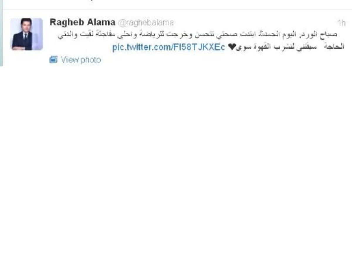 راغب غرد على "تويتر" معرباً عن سعادته بمفاجأة والدته فكتب "صباح الورد. اليوم الحمد لله ابتدت صحتي تتحسن وخرجت للرياضة واحلى مفاجأة لقيت والدتي الحاجة سبقتني لنشرب القهوة سوى".