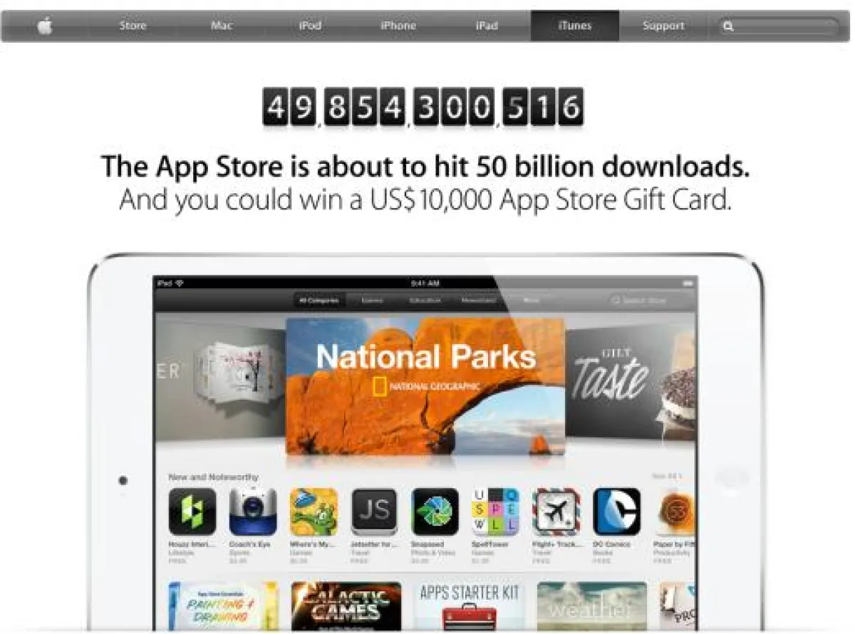 يتميز متجر أبل للتطبيقات بالتنظيم والاهتمام والتسويق، وكذلك عدد التحميلات وكثرة المستخدمين وجودة التطبيقات المطروحة، وكعادتها قامت أبل بطرح مسابقة ترويجية عند وصول عدد التحميلات إلى رقم ضخم وتاريخي للمتجر والهدية بقيمة 10 آلاف دولار أمريكي.