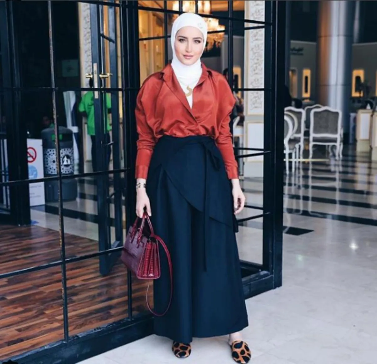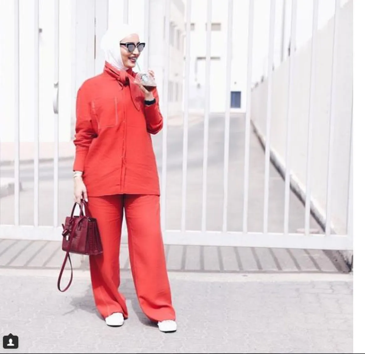 لاطلالة كاجوال مختلفة وجريئة، يمكنكِ اعتماد هذه البدلة أو التريننغ لمناسباتكِ العادية مثل ذهابكِ للتسوق، ولكن اعتمديها بهذا اللون الأحمر البرتقالي، مع حقيبة كلاسيكية من ماركة سانت لوران Saint Laurent على طريقة دلال.