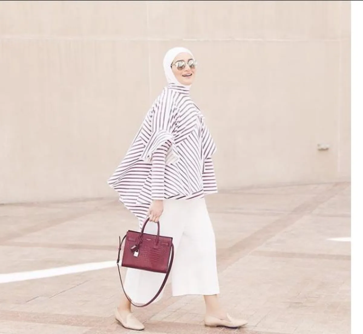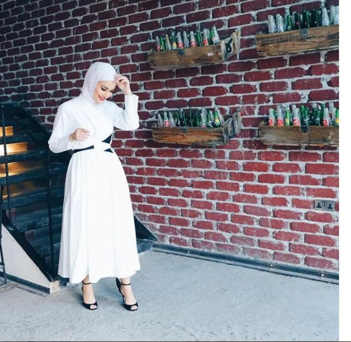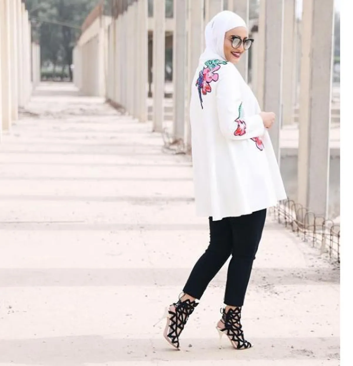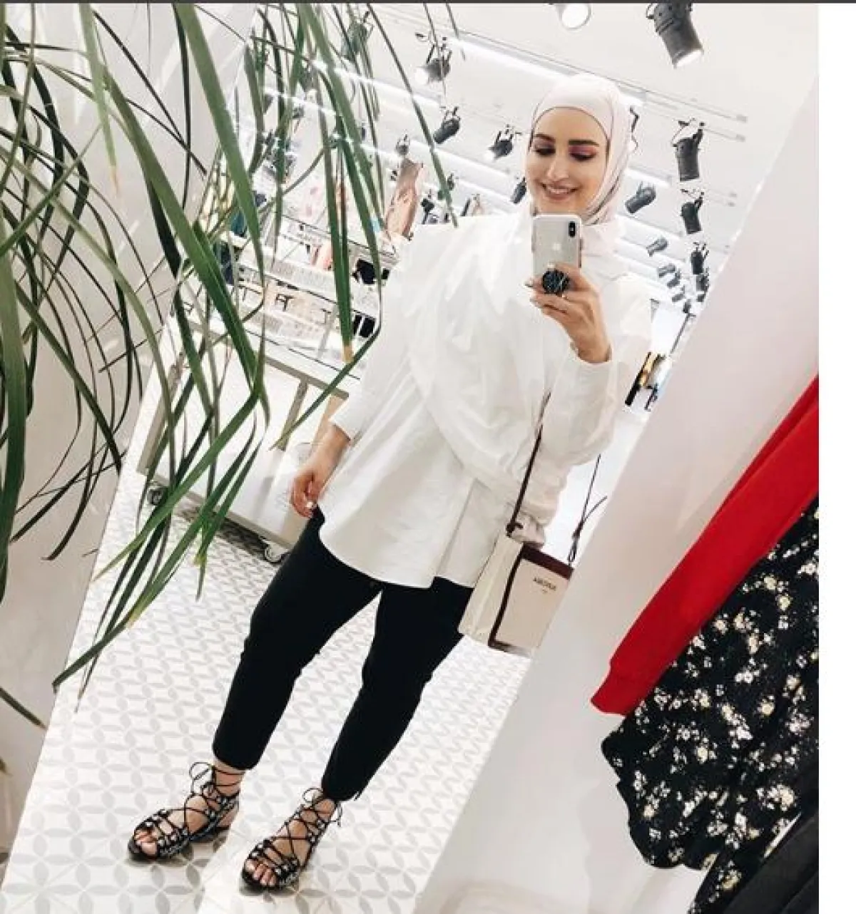 البنطلون الأسود وسليبر صيفي مكشوف مع الأربطة الأنيقة، والحجاب الأبيض.