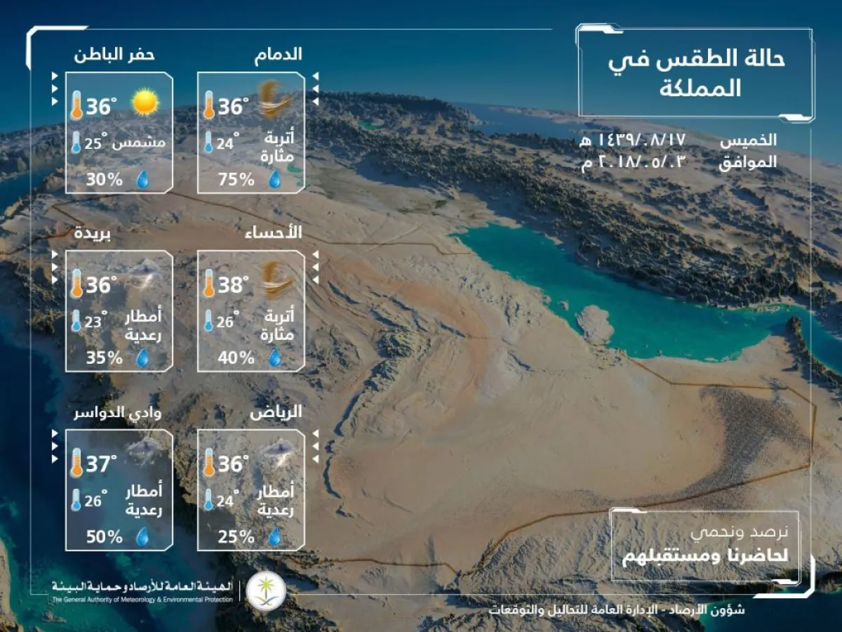 كشفت الهيئة العامة للأرصاد وحماية البيئة السعودية، أن منطقة الرياض ستشهد الخميس استمرار وجود تشكيلات من السحب منخفضة ومتوسطة الارتفاع، تتخللها سحب رعدية ممطرة مصحوبة بنشاط للرياح السطحية مع رؤية غير جيدة بسبب العوالق الترابية والأتربة المثارة.