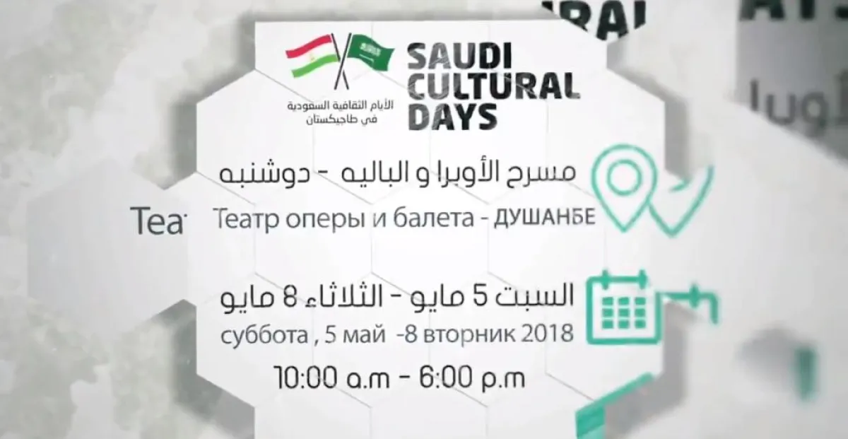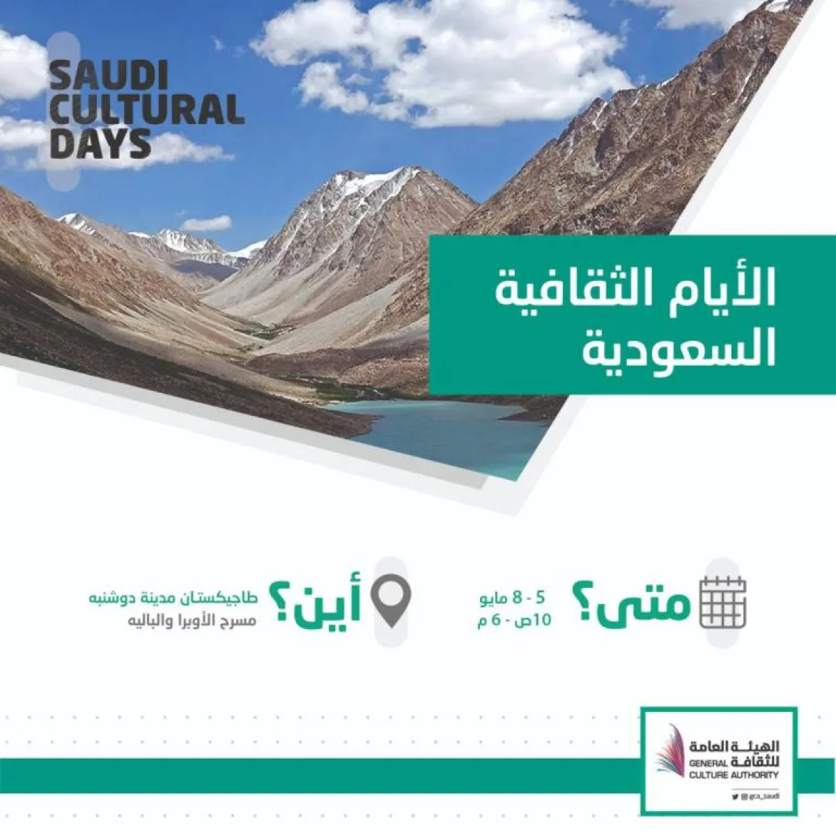بمشاركة نُخبة من الفنانين السعوديين في مجالات إبداعية متنوعة، تُنظّم الهيئة العامة للثقافة، ابتداءً من السبت 5 مايو الجاري، وحتى يوم الثلاثاء 8 مايو، فعاليات الأيام الثقافية السعودية في طاجيكستان.