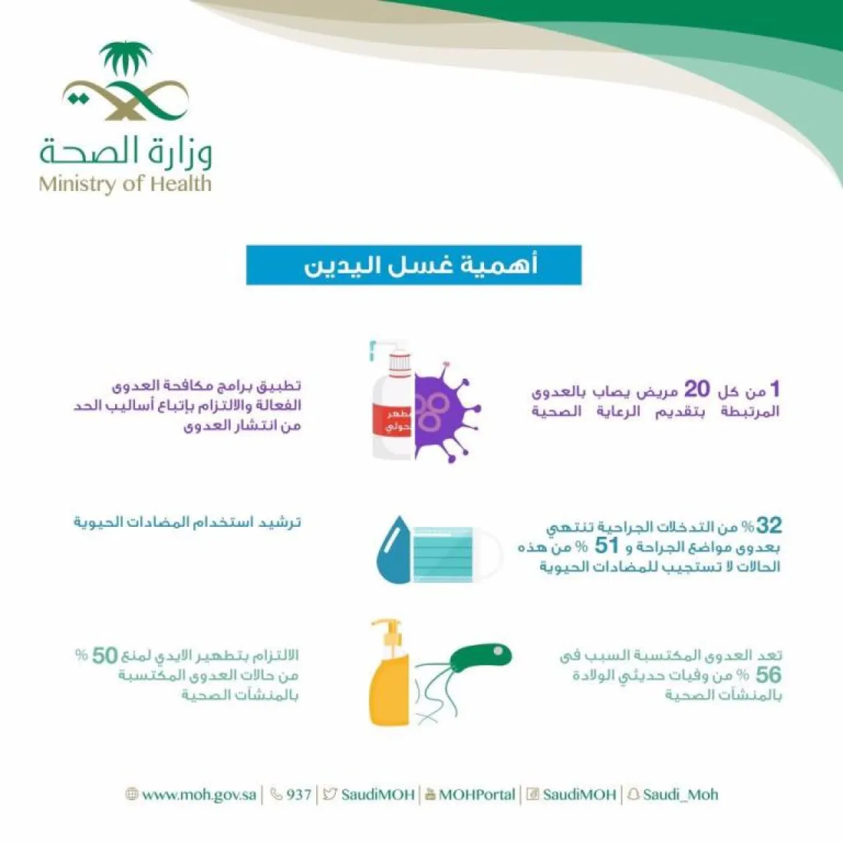 تزامناً مع اليوم العالمي لغسل اليدين، الذي صادف أمس السبت 5 مايو، كشفت وزارة الصحة السعودية، أن الالتزام بغسل اليدين يسهم في تقليل حالات العدوى في المستشفيات بنسبة ٥٠%.
