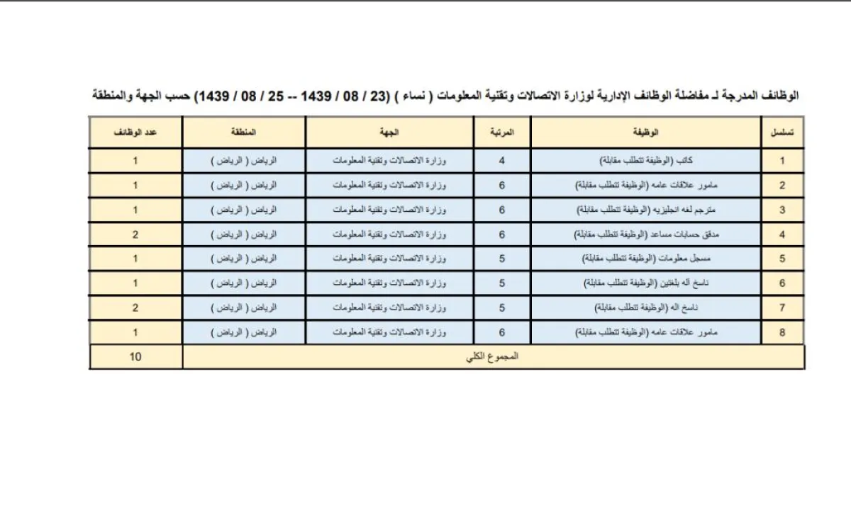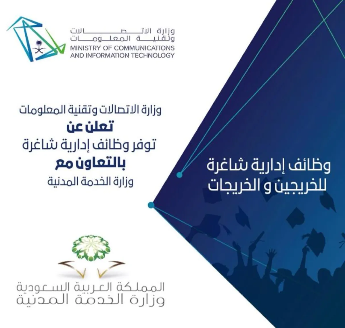 دعت وزارة الاتصالات وتقنية المعلومات السعودية، بالتعاون مع وزارة الخدمة المدنية، المواطنين والمواطنات الحاصلين والحاصلات على الدرجات العلمية والتخصصات المناسبة إلى شغل وظائف مشمولة بسلَّم رواتب الموظفين العام "الإدارية"، والتقدم عليها من خلال منظومة التوظيف "جدارة".