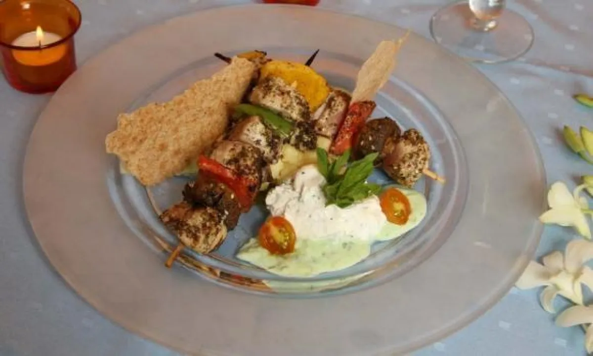 3-يتمّ توزيع قطع الدجاج والخضر المقطّعة على عيدان السيخ، ويتمّ شيّها على الشواية.