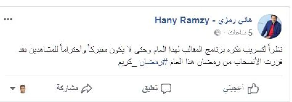 بعد ايام قليلة من إعلان انتقاله ببرنامج المقالب الشهير إلى قناة ONE، عاد الفنان هاني رمزي ليعلن تأجيل عرض البرنامج لهذا العام، بعدما تمّ تسريب الفكرة، مؤكداً أنّ الحلقات كانت ستبدو مفبركة، ولن يصدّقها المشاهد.