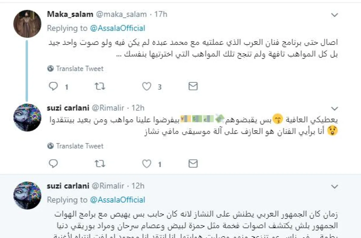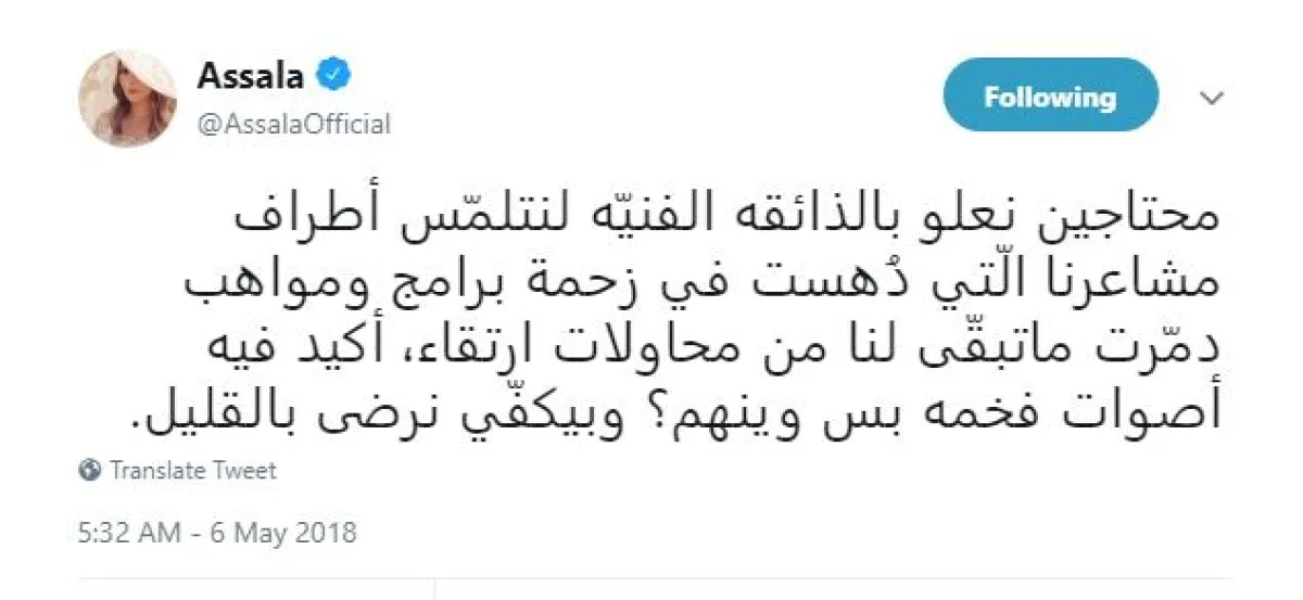 أصالة غرّدت عبر تويتر قائلة: محتاجين نعلو بالذائقة الفنيّة لنتلمّس أطراف مشاعرنا الّتي دُهست في زحمة برامج ومواهب دمّرت ما تبقّى لنا من محاولات ارتقاء، أكيد فيه أصوات فخمة بس وينهم؟ وبيكفّي نرضى بالقليل.