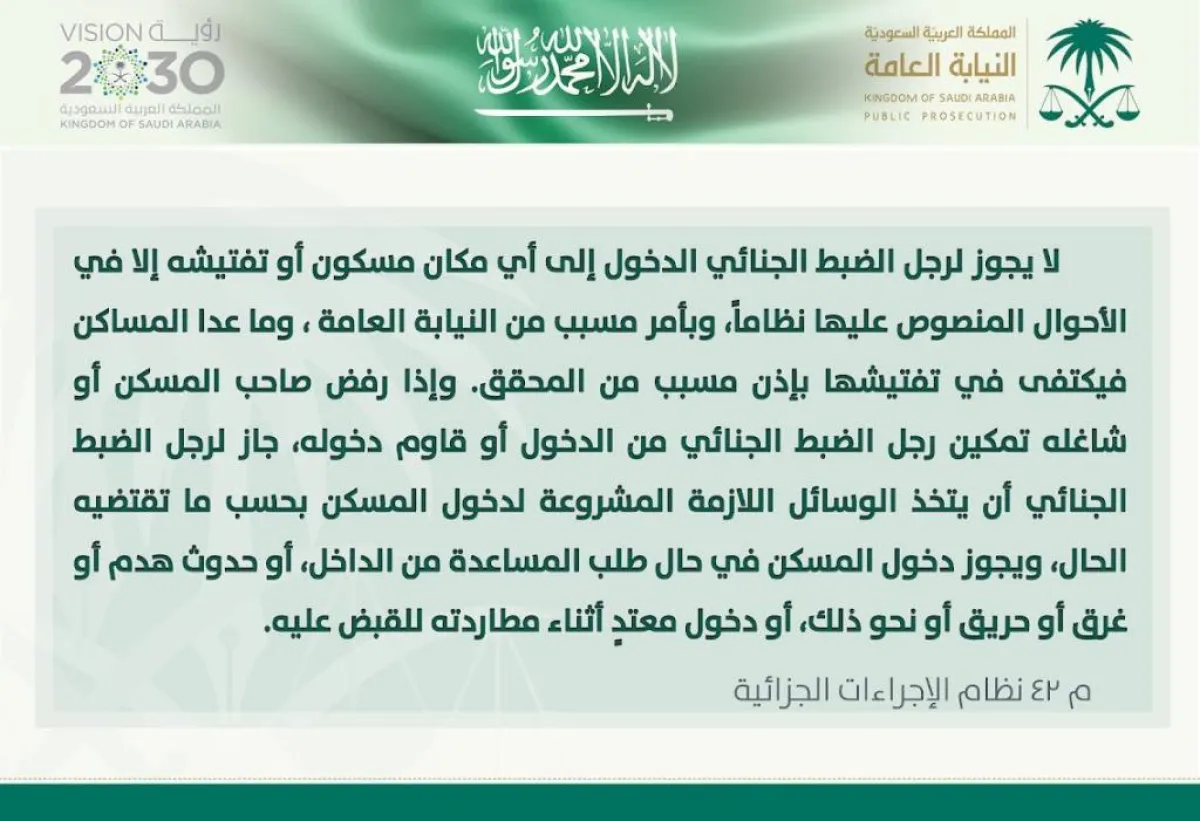 كشفت النيابة العامة السعودية عن حالات ثلاث استثنائية تُجيز لرجل الضبط الجنائي دخول أي مسكن وتفتيشه.