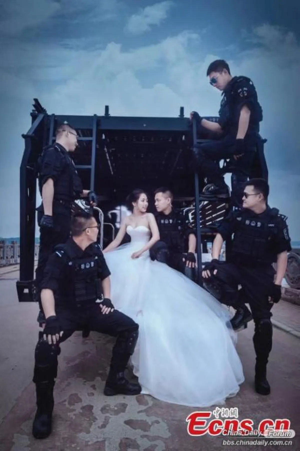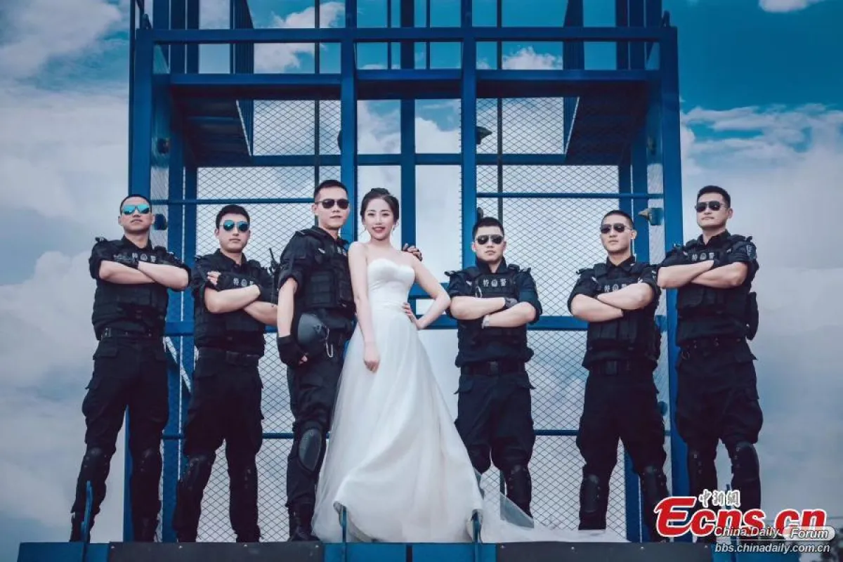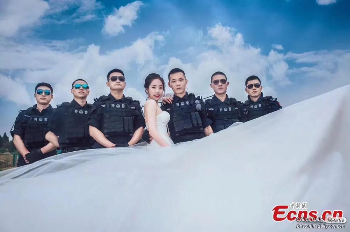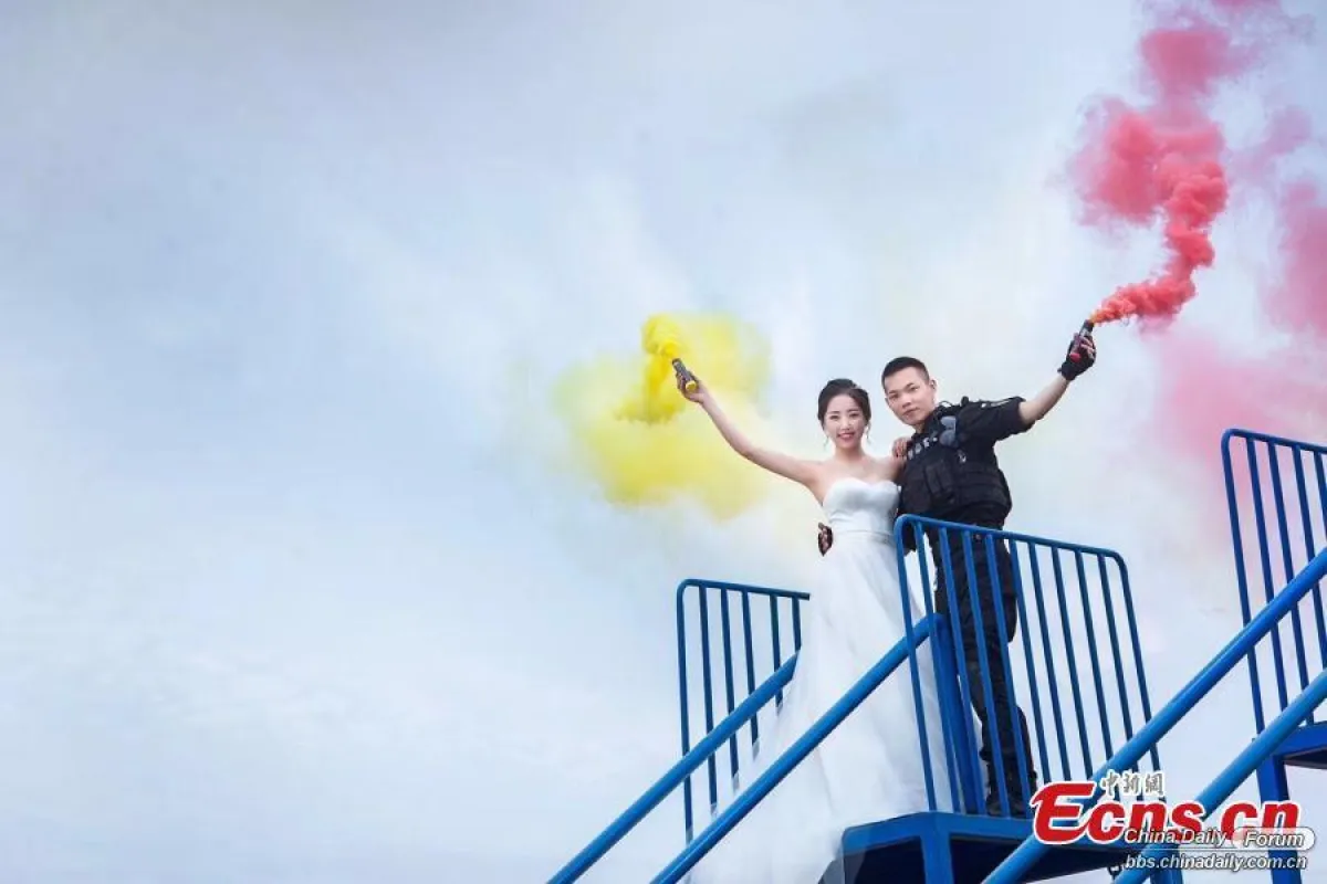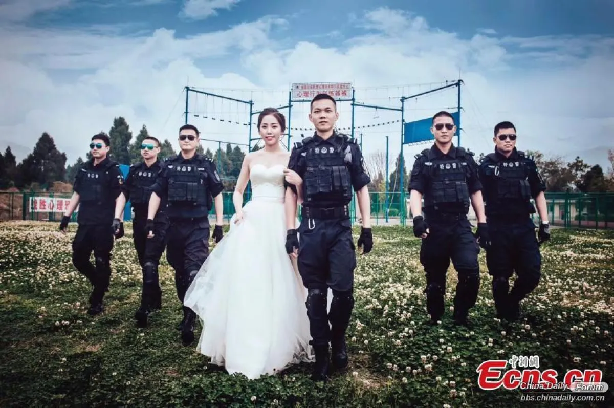 لم يجد ضابط في الشرطة الصينية الوقت لارتداء بدلة زفافه داخل موقع تدريبه، فقامت عروسه بإحضار المصور الى موقع التدريب وطلبت منه تصويرها معه بالزي العسكري .