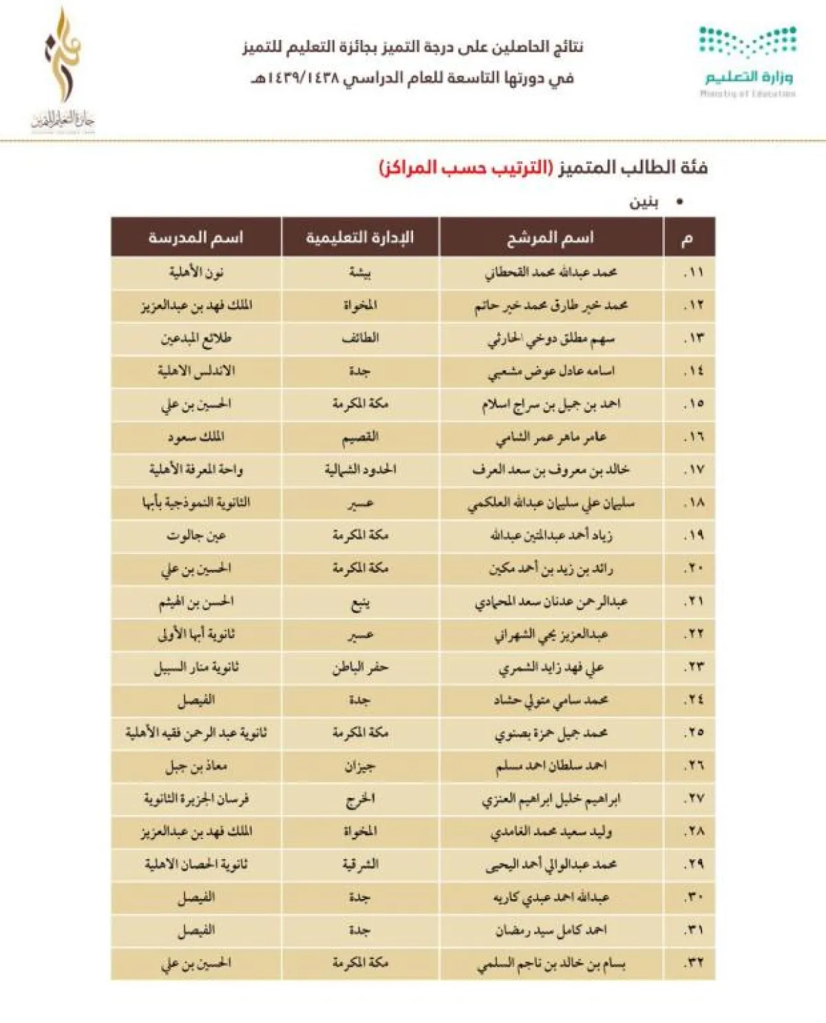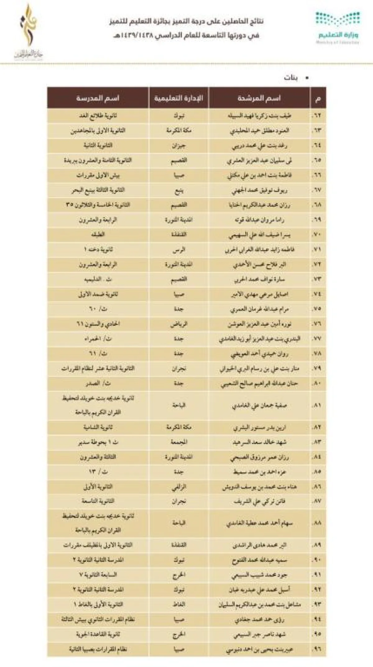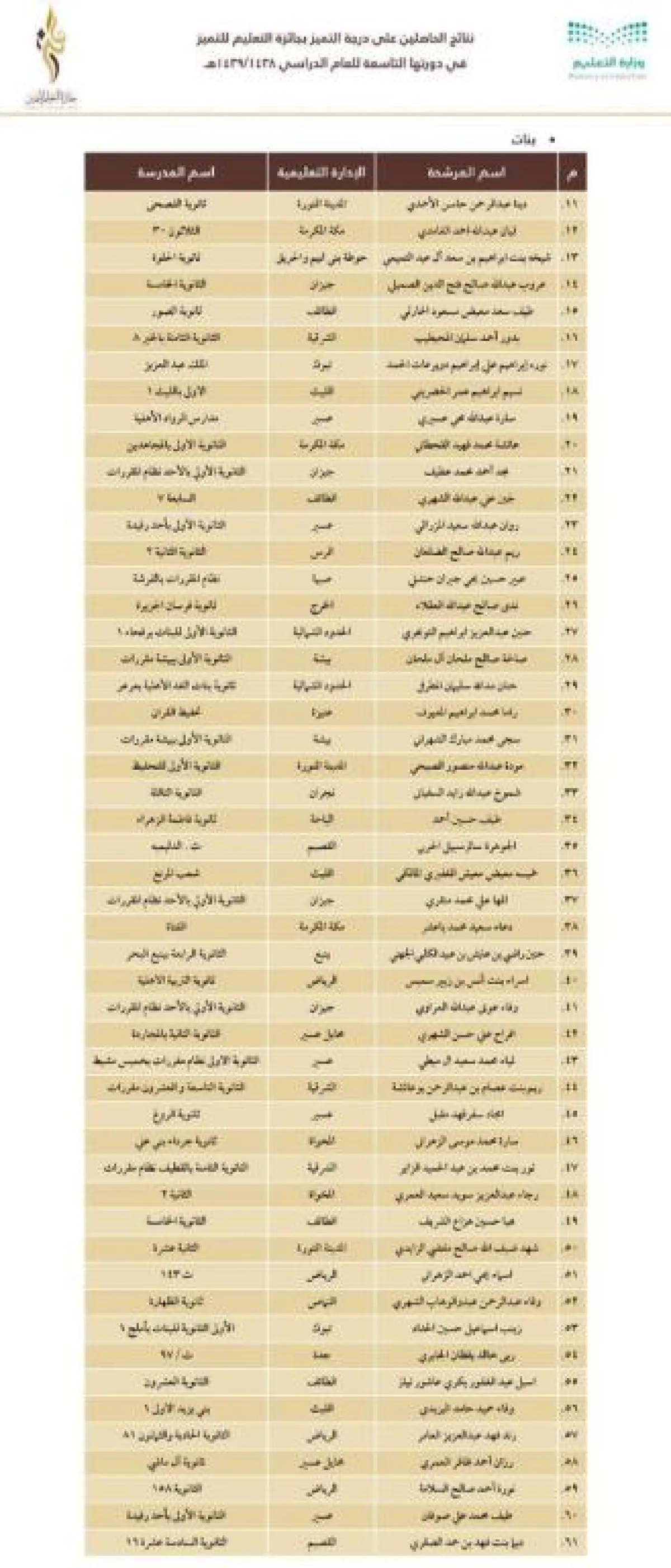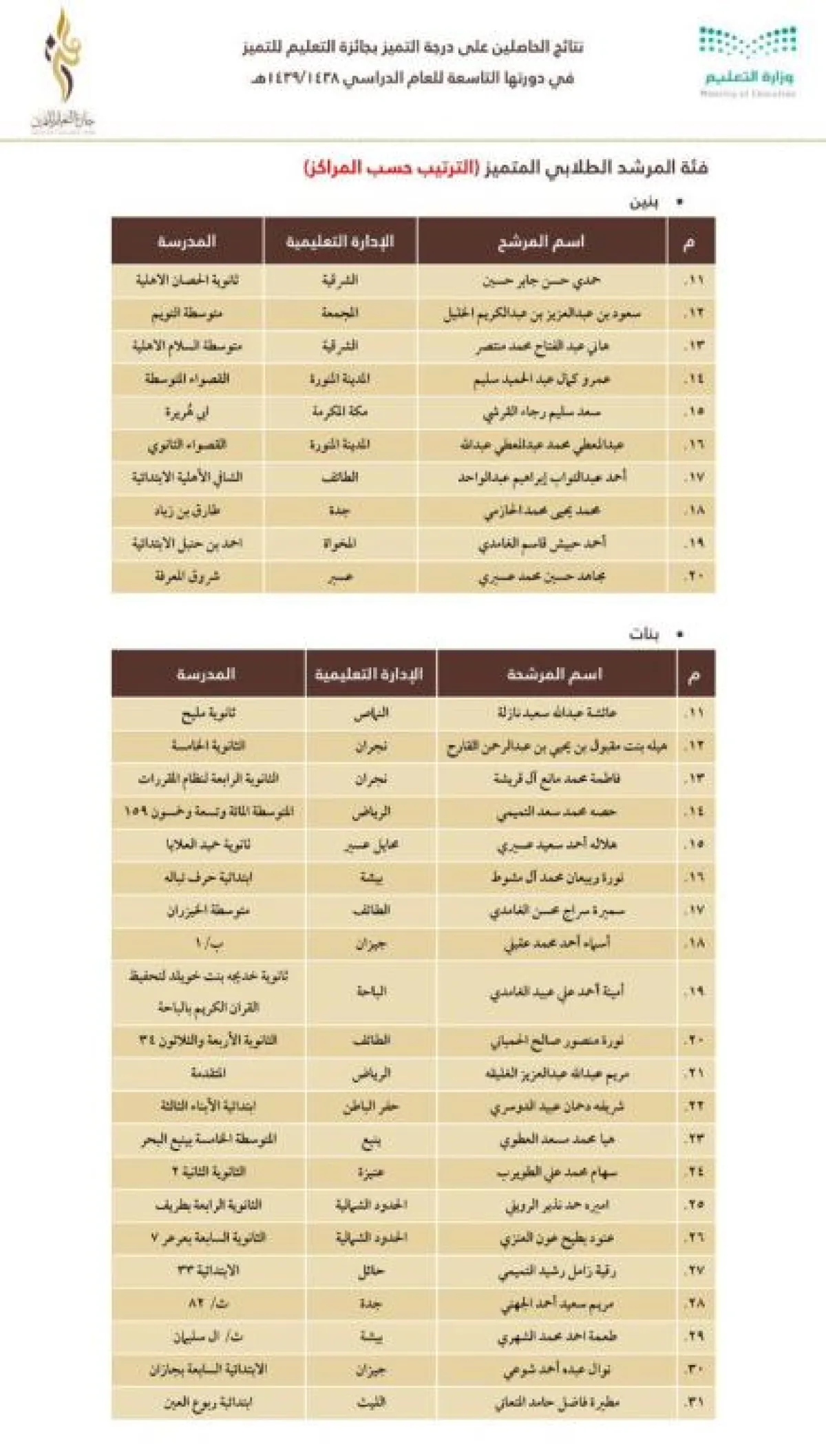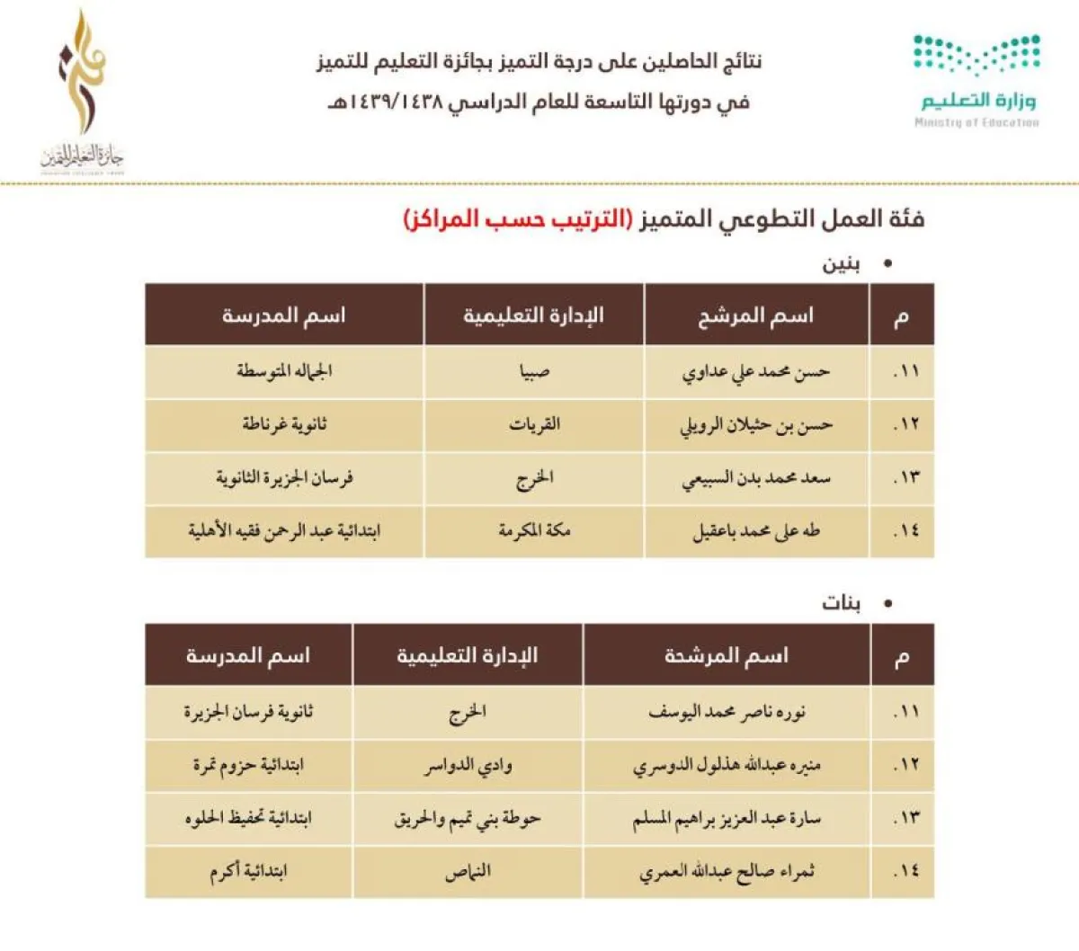 وجاءت نتائج الفائزين والفائزات والمدارس والإدارات الفائزة كما يلي: