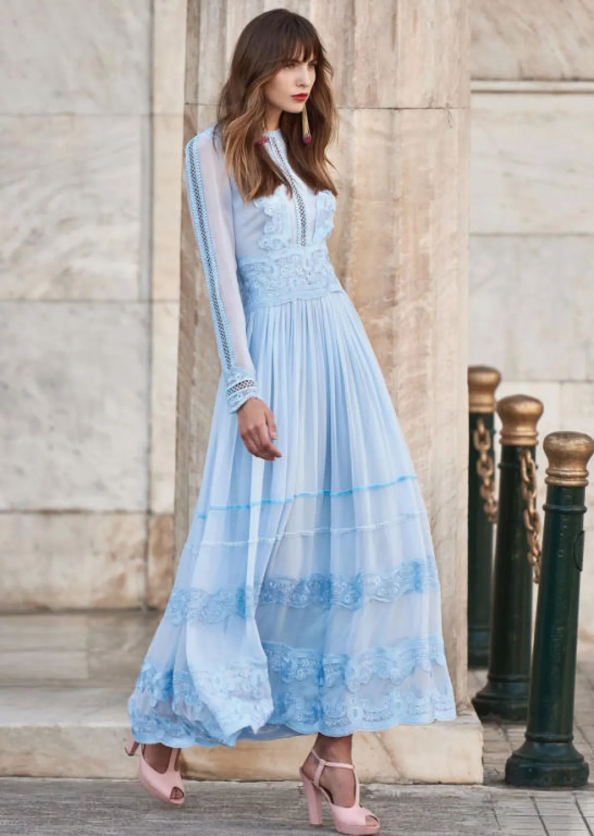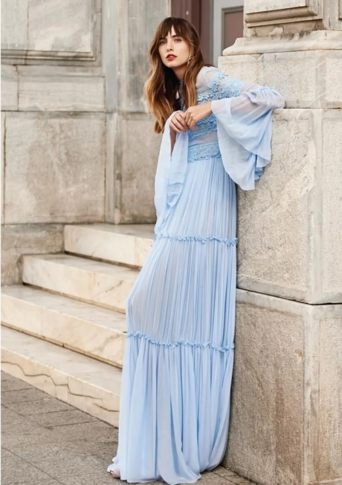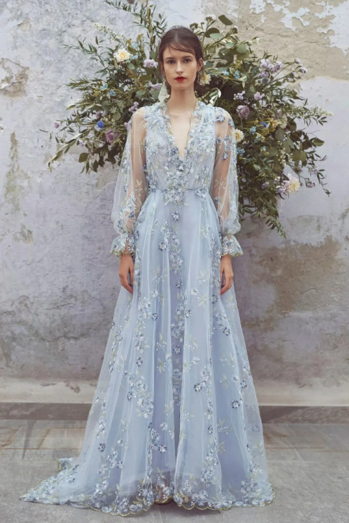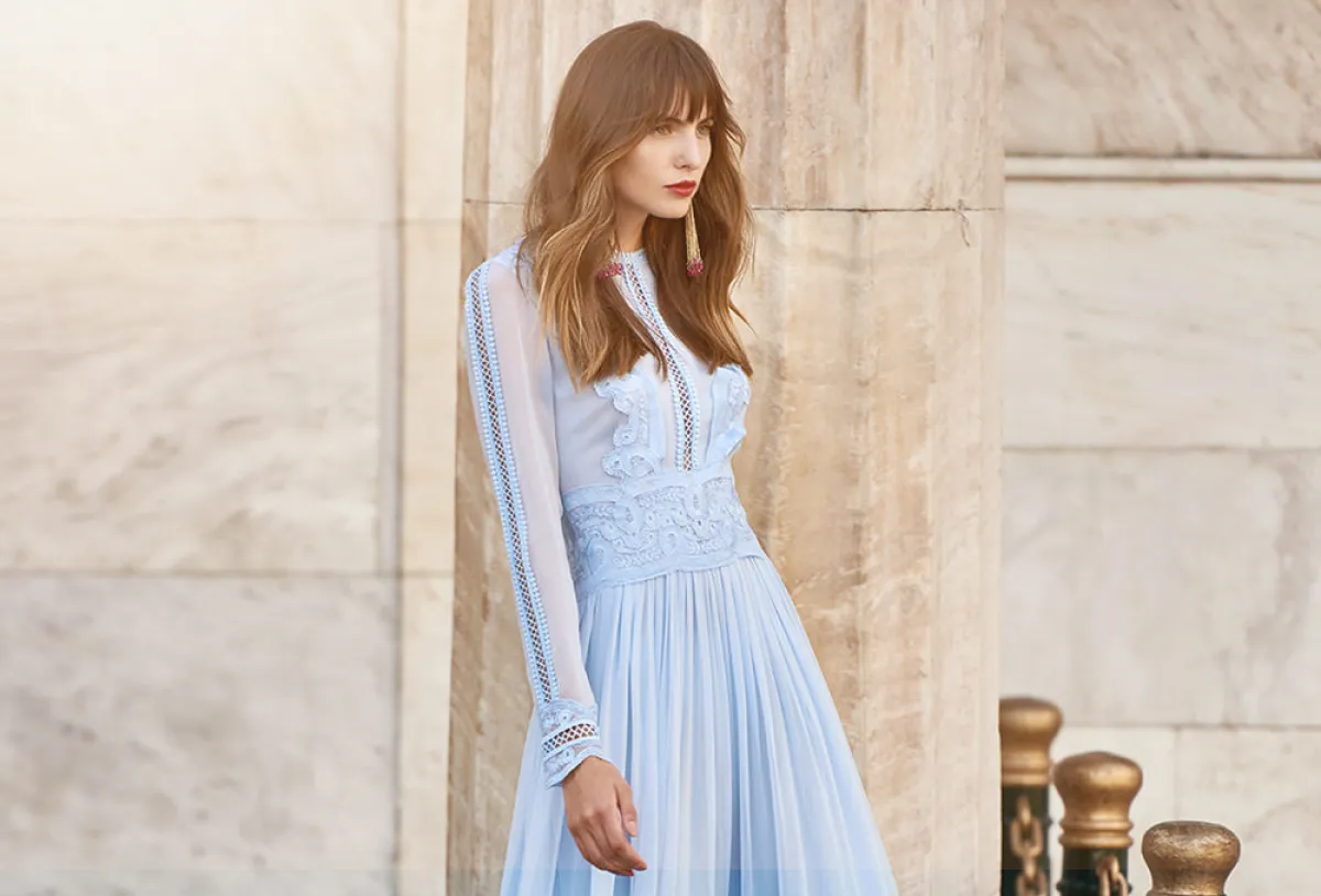 يتمتع اللون الأزرق المستوحى من السماء بجاذبية خاصة، فيتسم بنعومته ويضيف لمسة أنثوية لإطلالة المرأة، وخاصةً الفساتين بالخامات الشفّافة مثل فساتين Costarello، والدانتيل من Ganni وLuisa Beccaria.