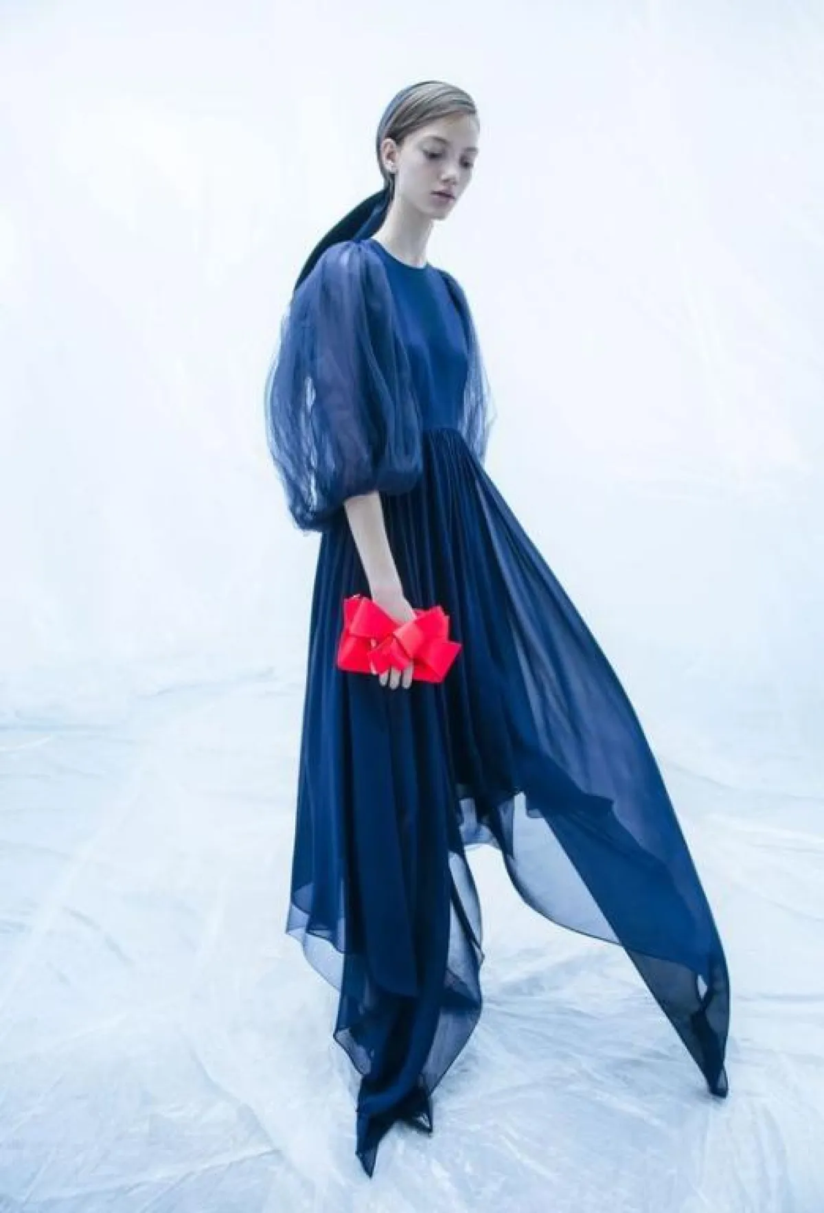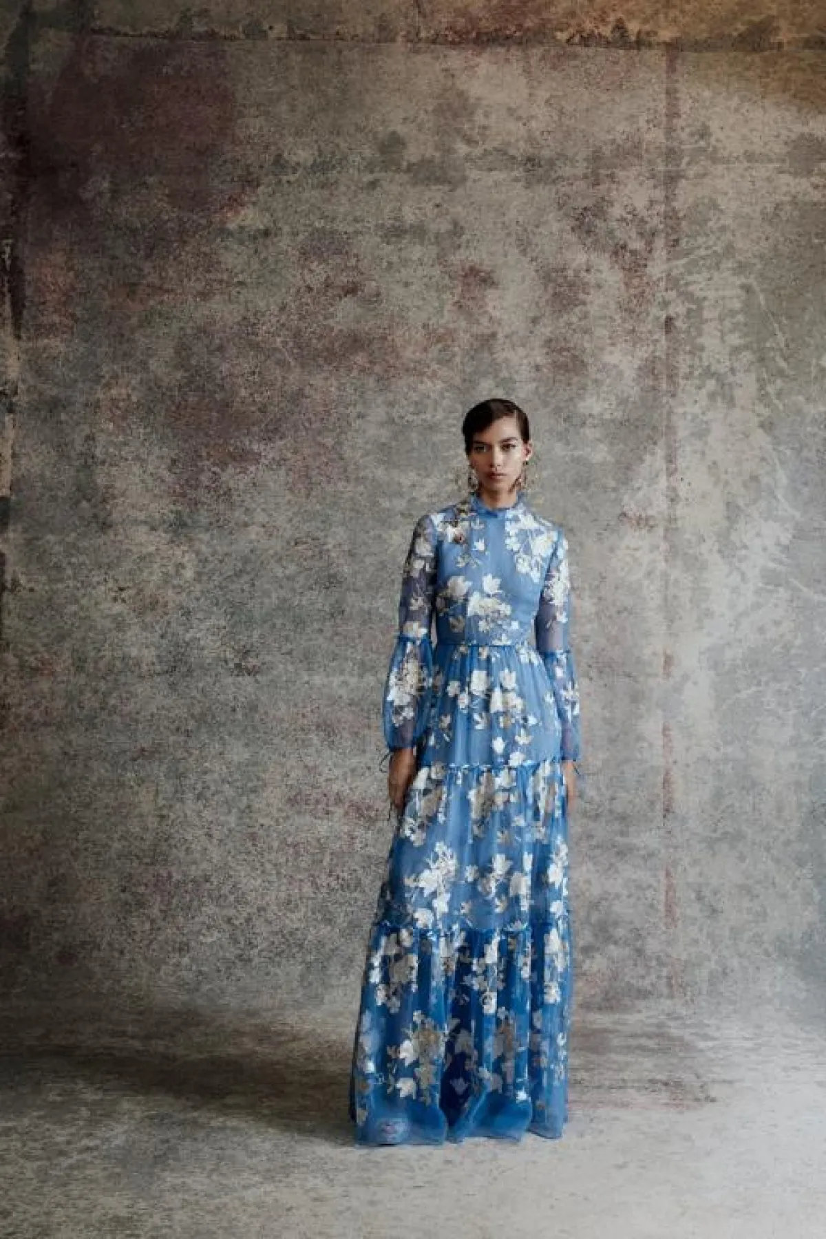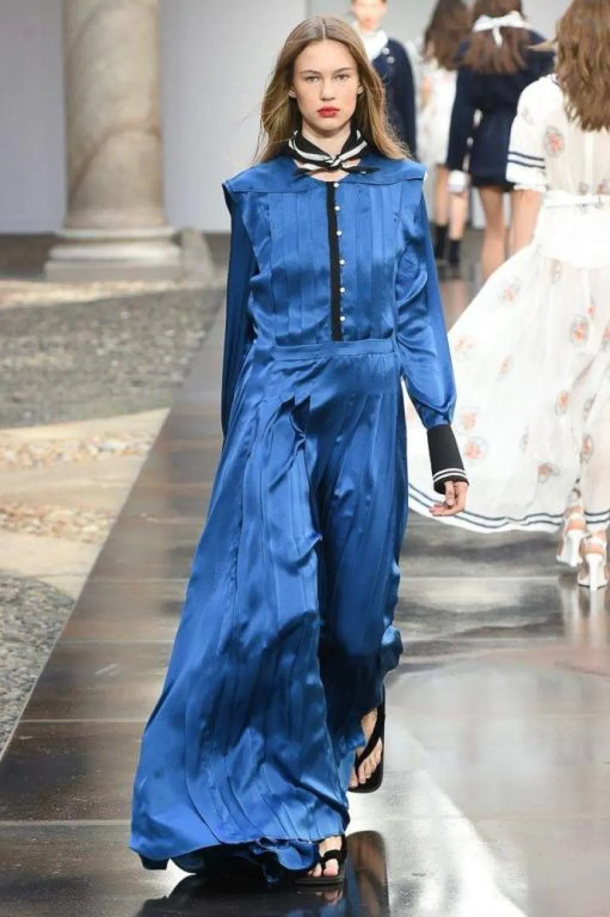 يتمتع اللون الأزرق المستوحى من السماء بجاذبية خاصة، فيتسم بنعومته ويضيف لمسة أنثوية لإطلالة المرأة، وخاصةً الفساتين بالخامات الشفّافة مثل فساتين Costarello، والدانتيل من Ganni وLuisa Beccaria.