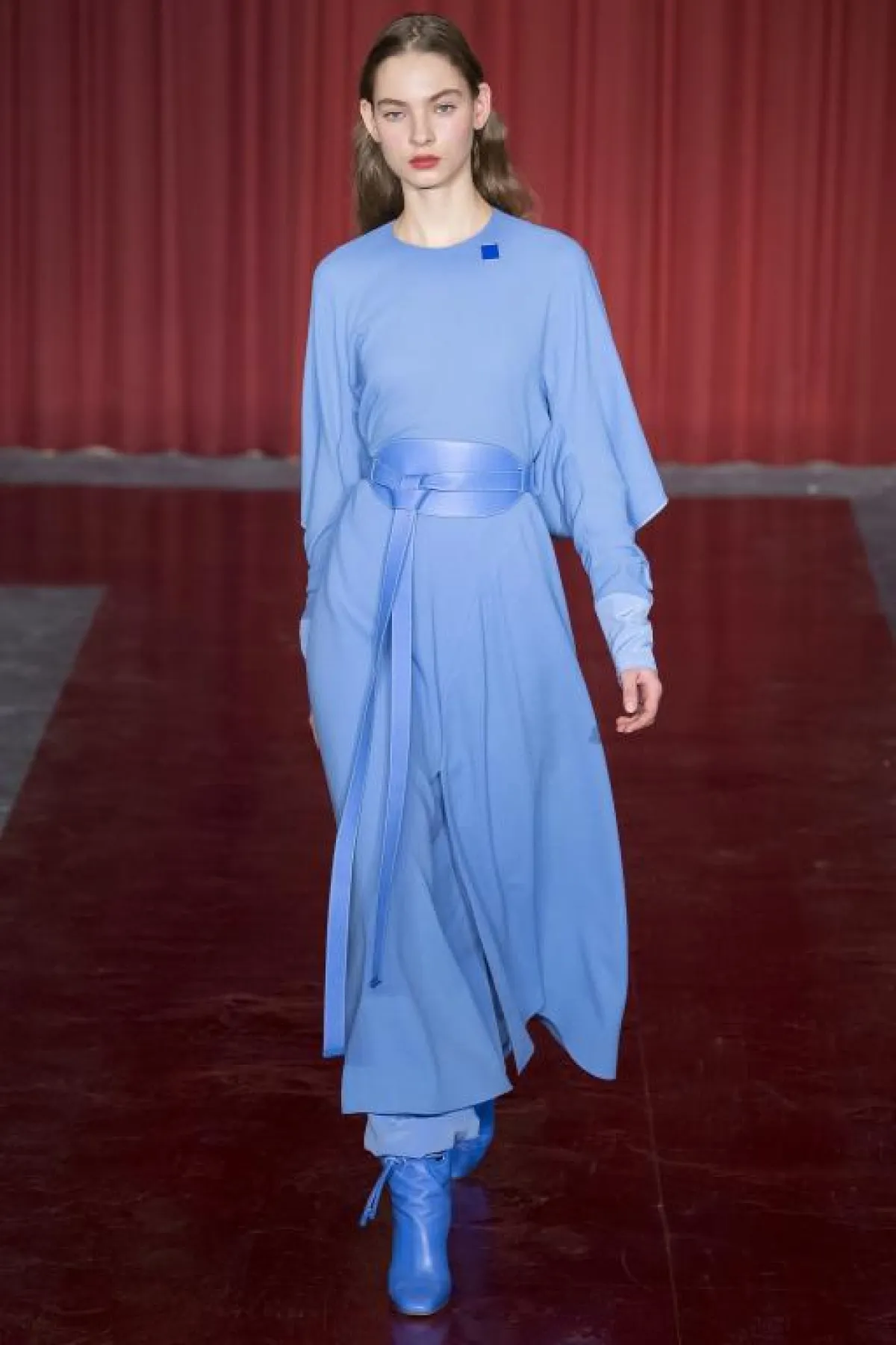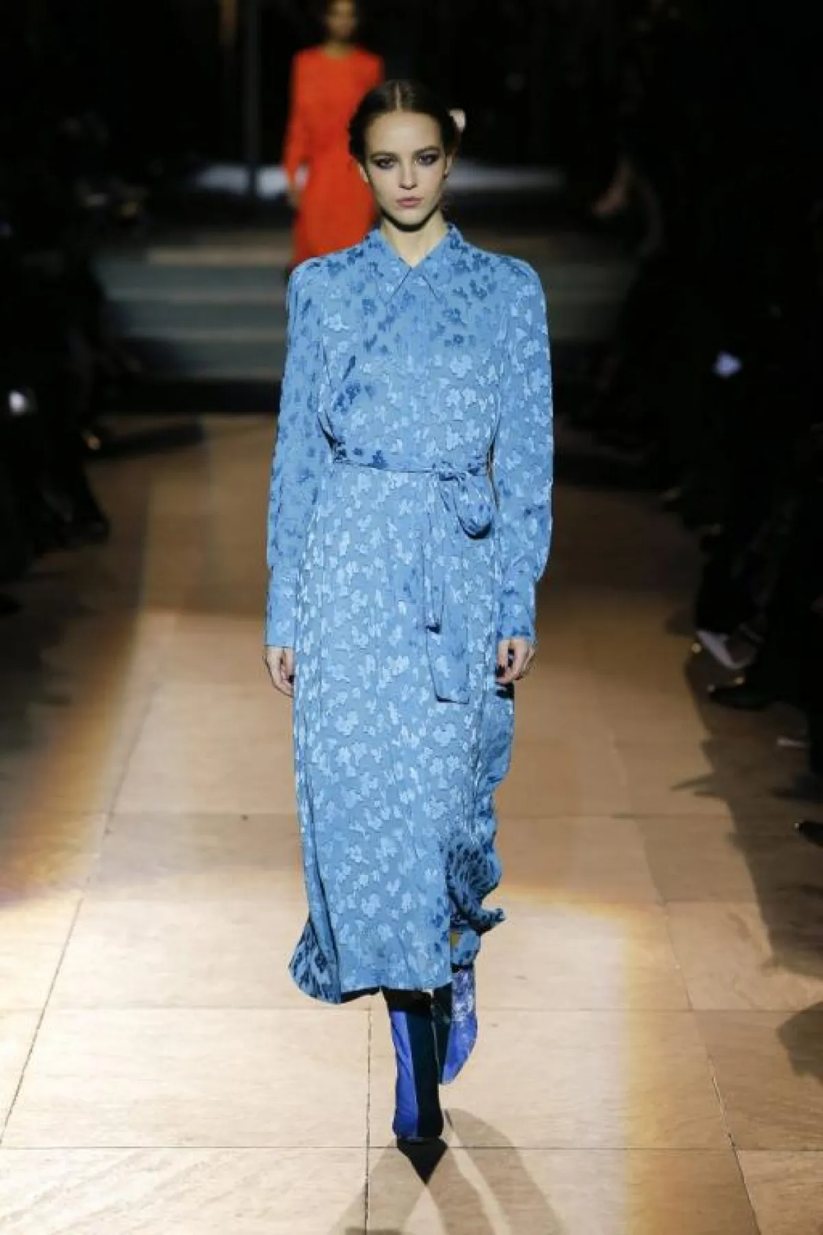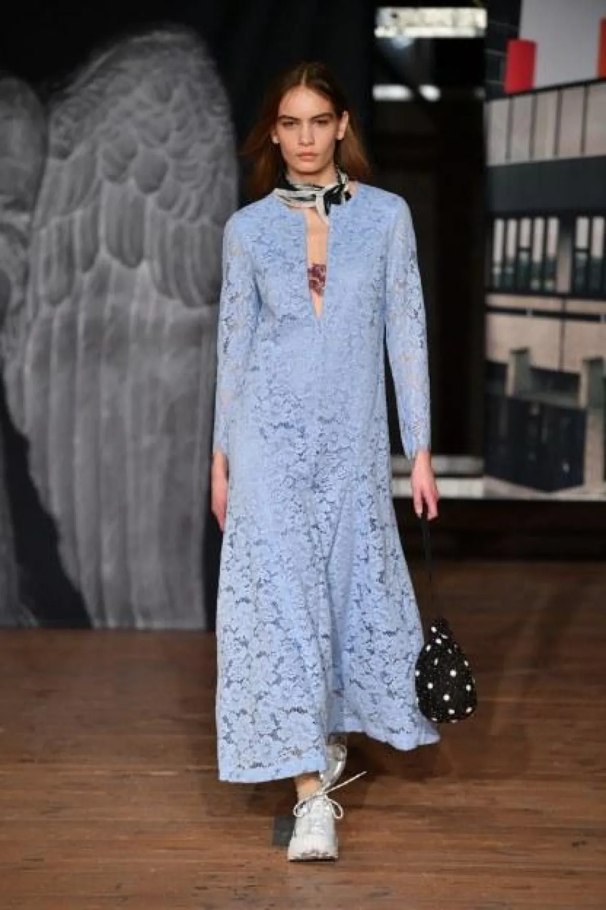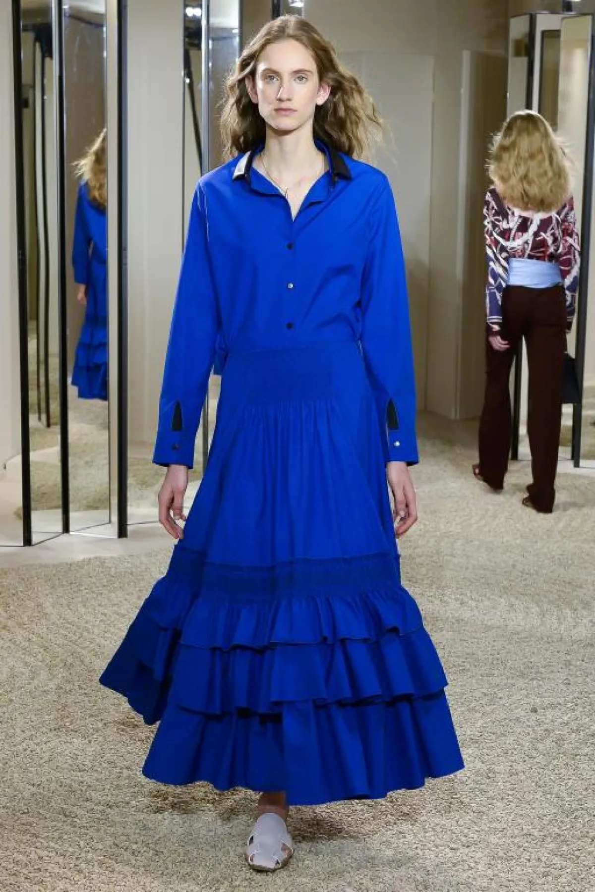 يتمتع اللون الأزرق المستوحى من السماء بجاذبية خاصة، فيتسم بنعومته ويضيف لمسة أنثوية لإطلالة المرأة، وخاصةً الفساتين بالخامات الشفّافة مثل فساتين Costarello، والدانتيل من Ganni وLuisa Beccaria.