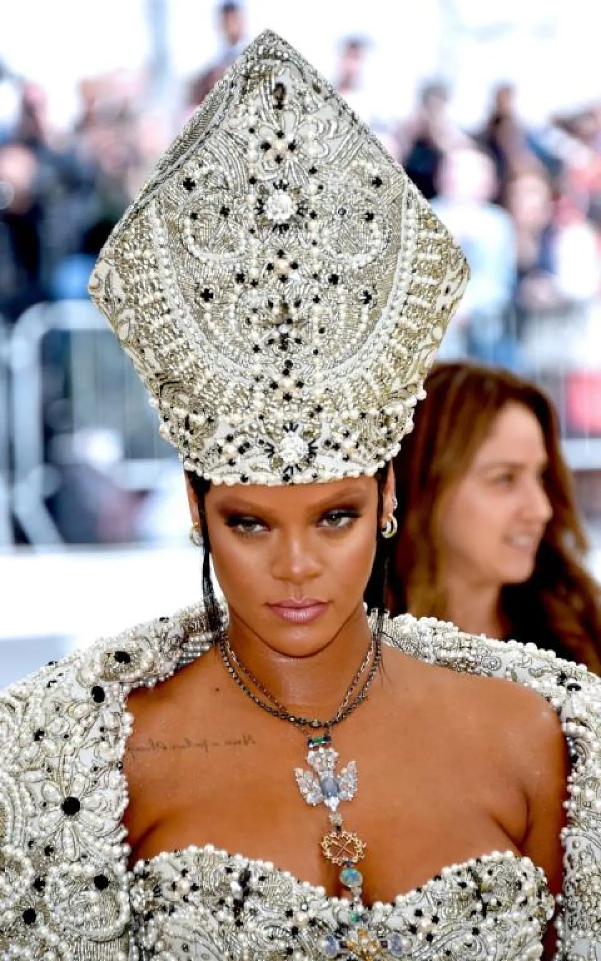 ولفتتنا أيضاً إطلالة ريهانا Rihanna التي اختارت زياً من توقيع دار ميزون مارجييلا Maison Margiela زيّنته بعقد بارز من كارتييه Cartier.