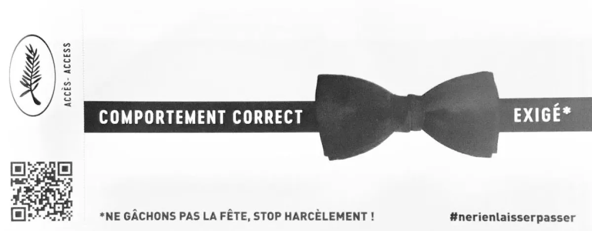 وقد خصص المهرجان رقم هاتف خاص للتبليغ عن أية ممارسات تشكل تحرشاً بحق النساء العاملات في حقل السينما. ورفعت "سوق الفيلم"، التي تُعقد على هامش المهرجان، وتعد أكبر تجمع عالمي للمنتجين السينمائيين، شعاراً ضد التحرش لخصه الهشتاغق #nerienlaisserpasser، أي عدم ترك أي تصرف مشين يمر دون عقاب. ورافق هذا الهاشتاق شعار على شكل ربطة فراشة يقول: "إن التصرف بشكل لائق أمر إجباري"، وهو اقتباس من الشعار التقليدي لحفلات المهرجان الذي يشترط ارتداء زي لائق.
