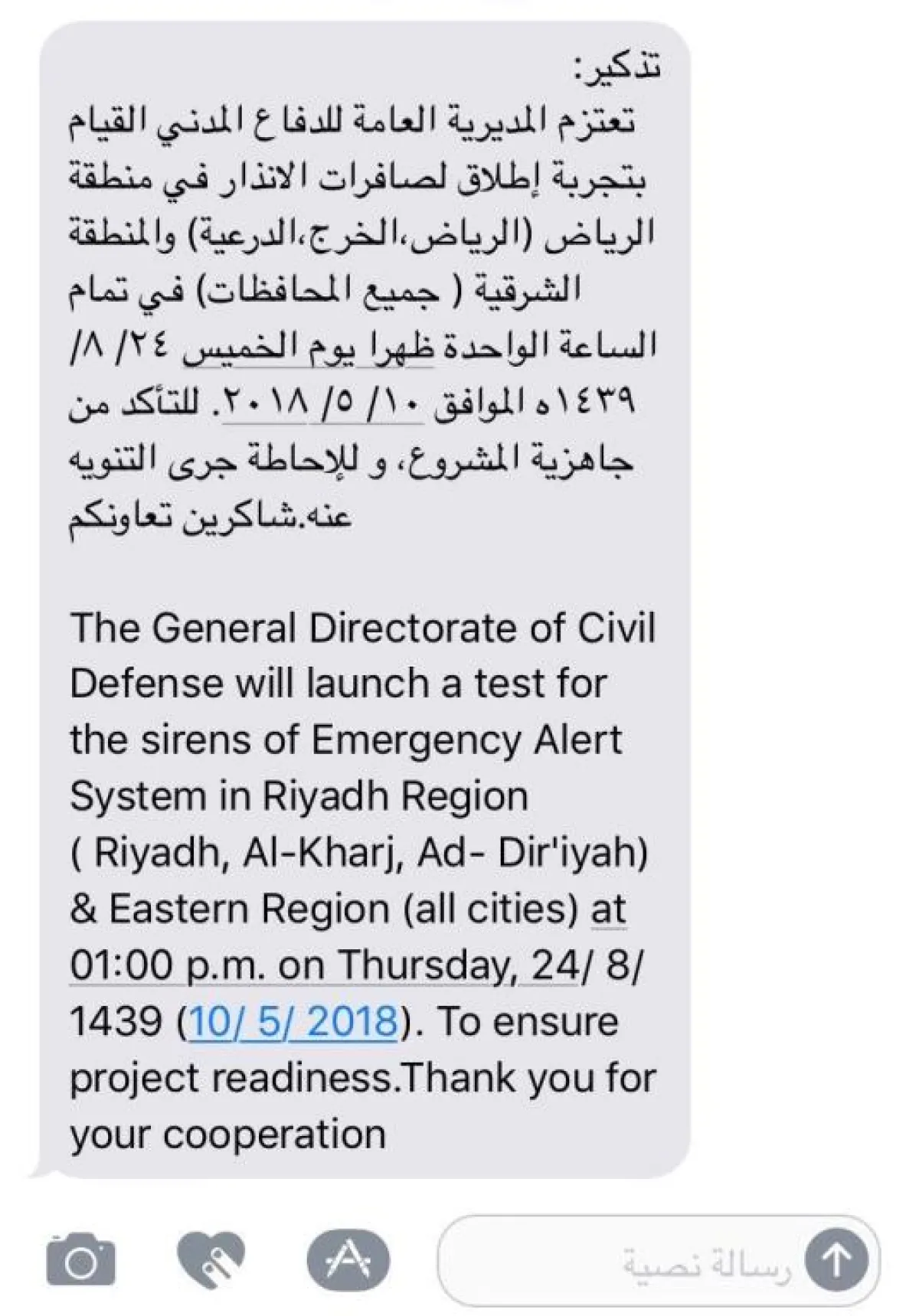 وجاء في نص الرسالة: تعتزم المديرية العامة للدفاع المدني القيام بتجربة إطلاقٍ لصافرات الإنذار في منطقة الرياض "الرياض، الخرج، والدرعية"، والمنطقة الشرقية "جميع المحافظات" في تمام الساعة الواحدة من ظهر الخميس 24/08/1439هـ الموافق 10/05/2018م، للتأكد من جاهزية المشروع، وللإحاطة جرى التنويه عنه، شاكرين تعاونكم.