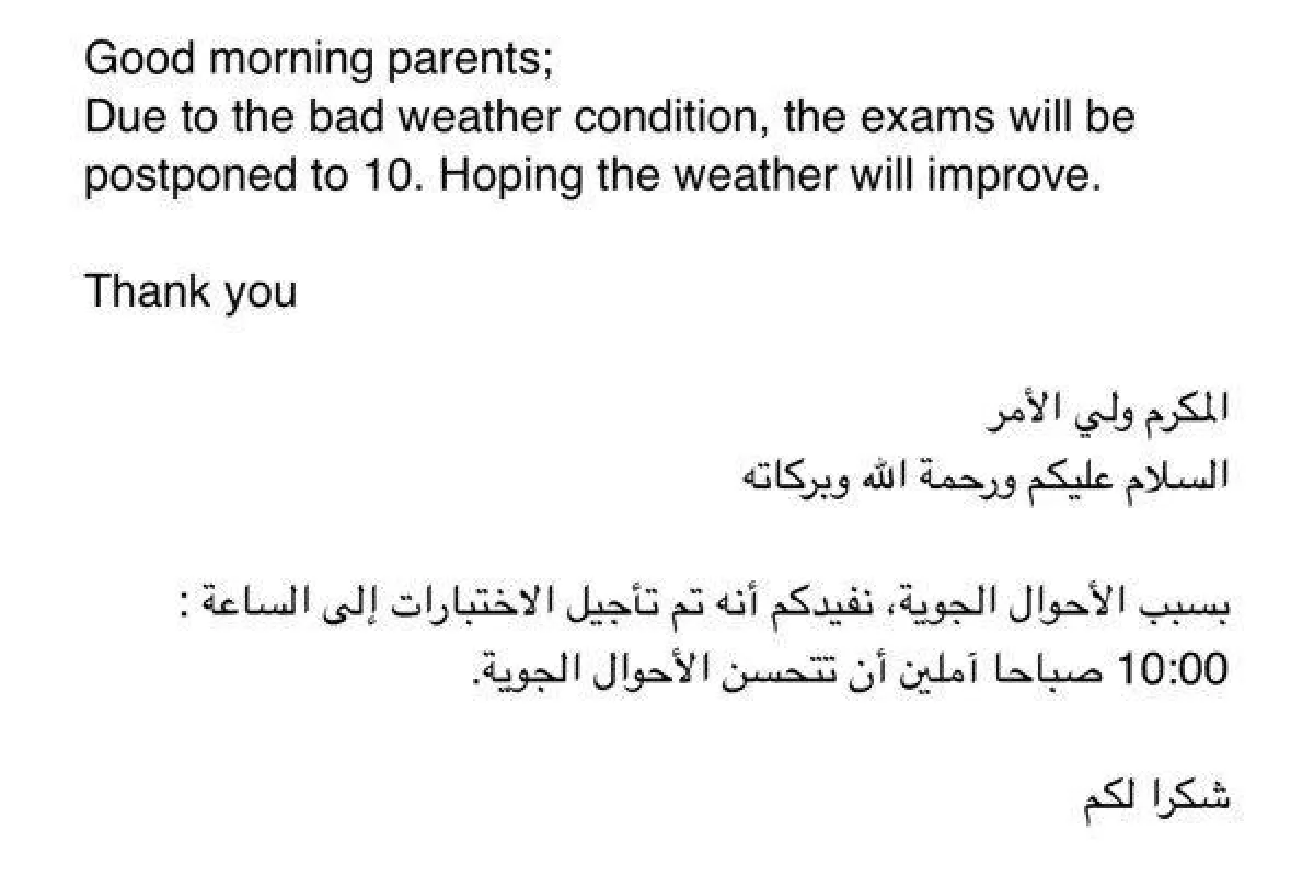 حيث أجّلت جميع اللجان بكلية العلوم والدراسات الإنسانية في محافظة ضرماء، اختباراتها للطلاب إلى الساعة العاشرة صباحًا، كما قامت بعض المدارس أيضًا بتأجيل دراسة الصغار، حيث قامت مدارس الملك فيصل بالرياض بإرسال رسالة إلى الأهالي وأولياء أمور الطلاب قائلةً "إنه نظرًا للظروف الجويّة الخطرة، نفيدكم بتعليق الدراسة -اليوم الأربعاء- للمراحل الدراسية من الروضة وحتى الصف الحادي عشر، وسوف يُقام اختبار الصف الثاني عشر في موعده اليوم الساعة 12 ظهرًا، وعلى الطلاب الحضور لأداء الاختبار لهذا اليوم، وسيتم موافاتكم بأي تفاصيل جديدة برسالة نصيَّة".