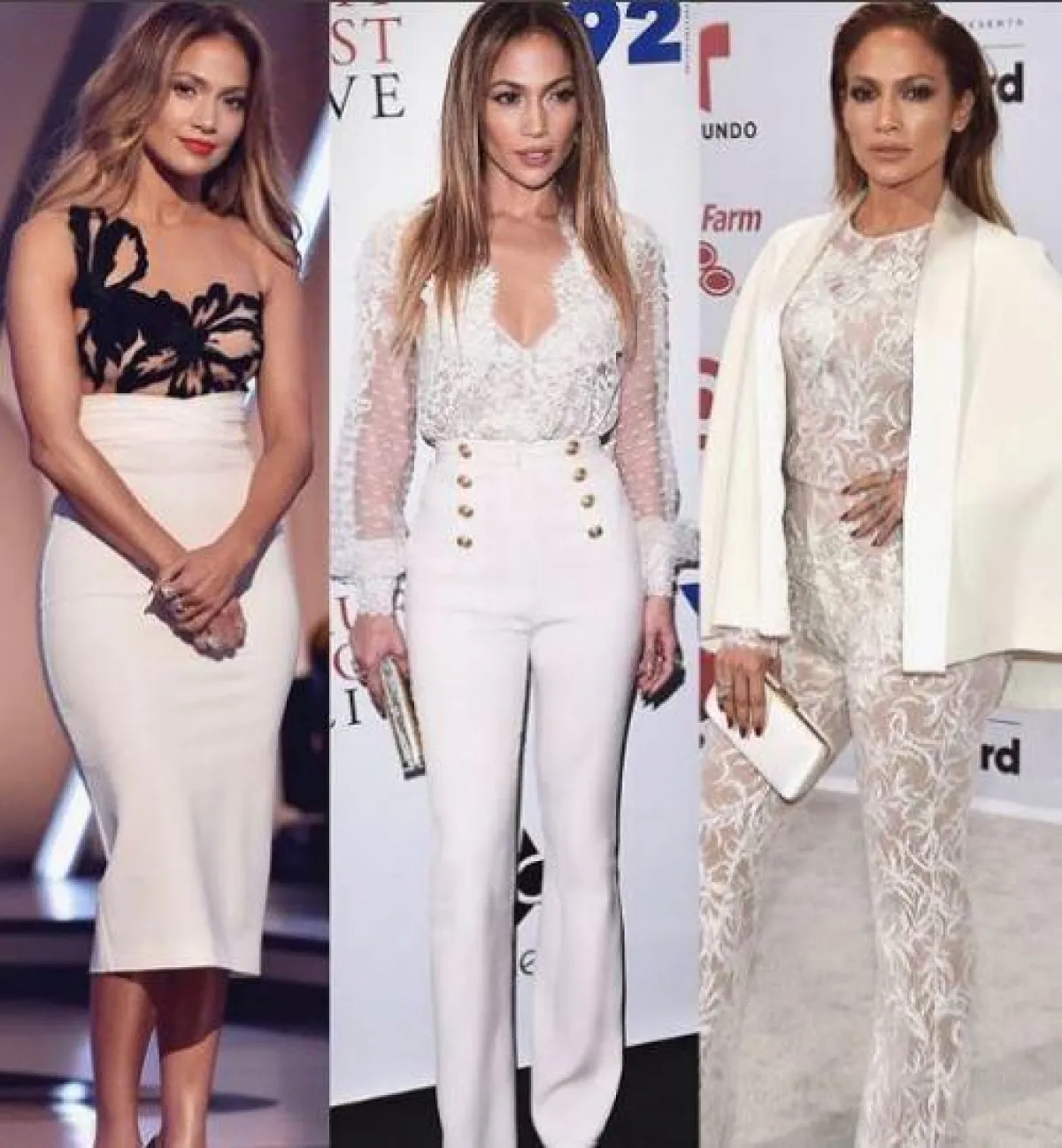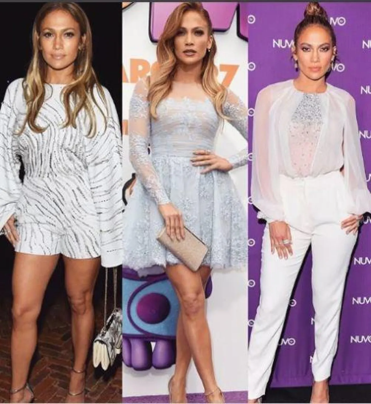 كما يلائم اللون الأبيض جنيفر كثيرًا، لهذا تختاره بتصاميمه المتعددة سواء كان بنطلون الشارليستون، أو الفستان المنقسم لنصفين، جيب وتوب، لإبراز عضلات البطن لـ لوبيز.