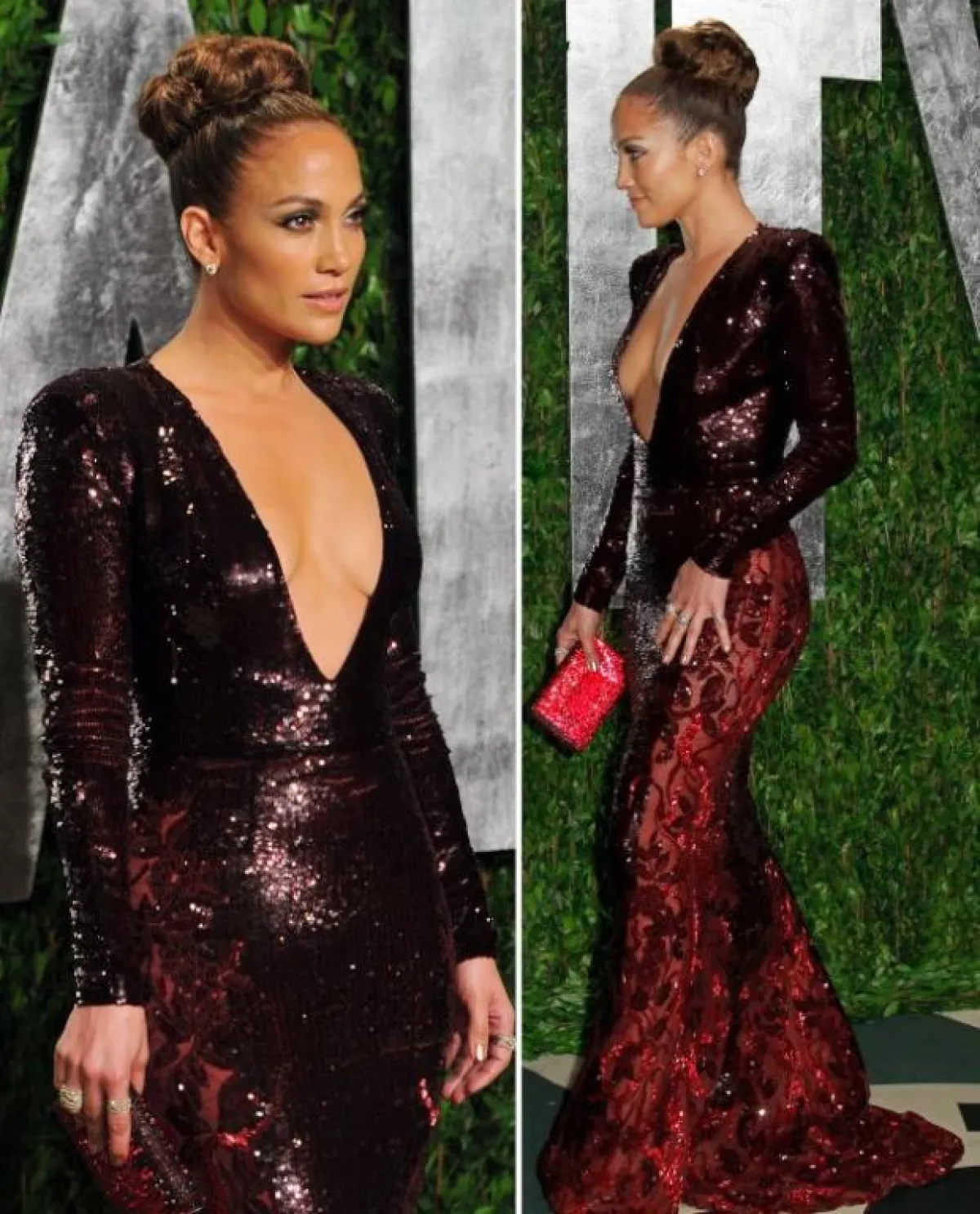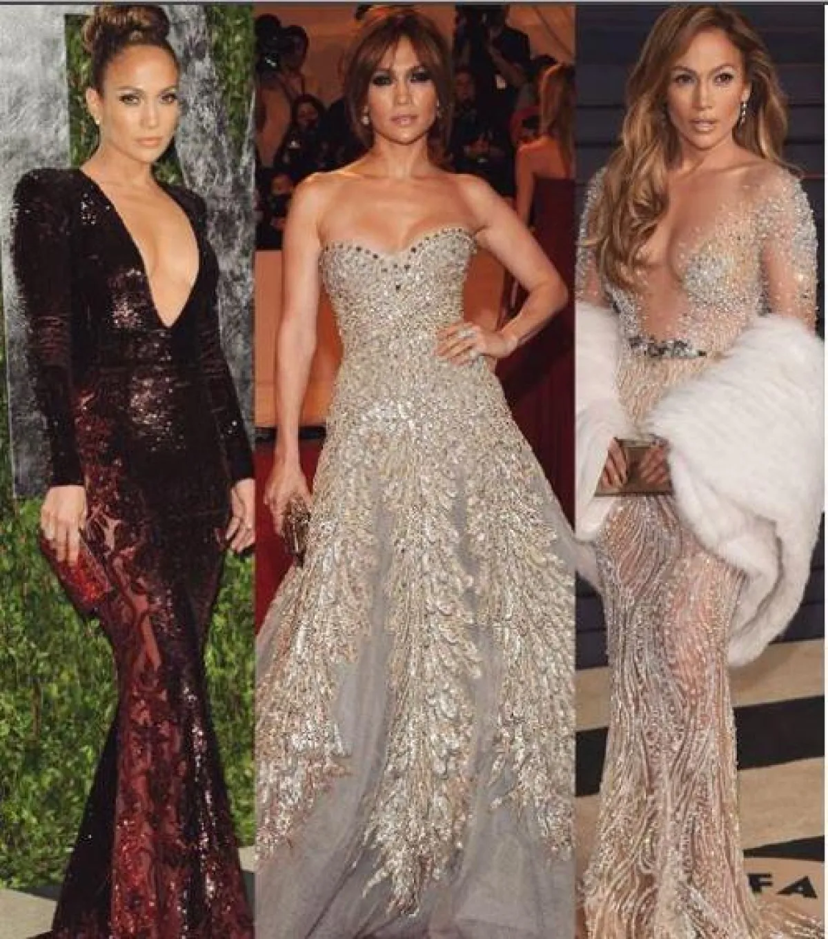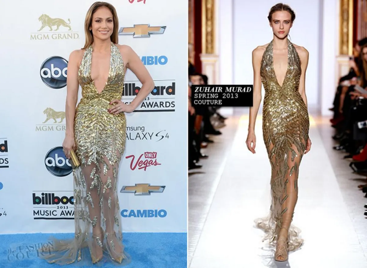 تميل جنيفر لوبيز لإبراز جمال جسدها الممشوق، وهذا الأمر يستطيع المصمم العالمي زهير مراد التعبير عنه بـ فساتينه، بخاصة بـ الجمبسوت الشفاف، مصمّم بتطريزات أوراق الشجر المتفرعة، والمفتوح من ناحية الصدر.