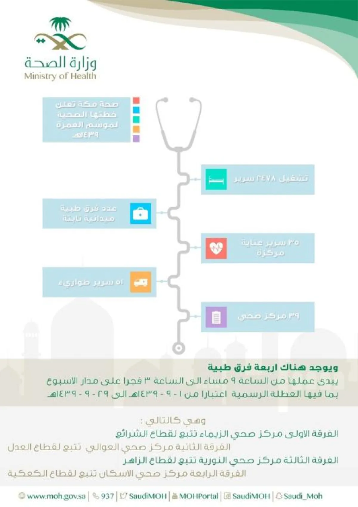 وقد نشرت صحة مكة المكرمة عبر موقعها الإلكتروني صورة توضح فيها الخطة التشغيلية التي اعتمدتها لموسم العمرة لهذا العام 1439هـ.