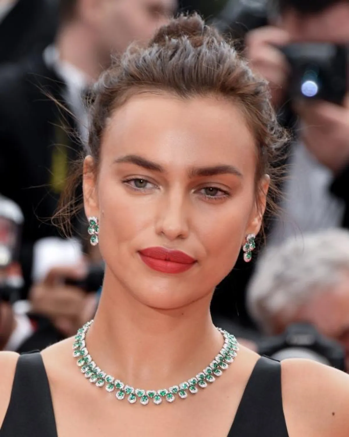 عارضة الأزياء إيرينا شايك اعتمدت إطلالة جذابة جداً، إذ ركزت فقط على إبراز شفتيها باعتمادها أحمر الشفاه المات، مع البلاش الوردي الذي عزز جمال عينيها ووجهها. وأكملت إيرينا طلتها بـ تسريحة الكعكة الفوضوية العالية.