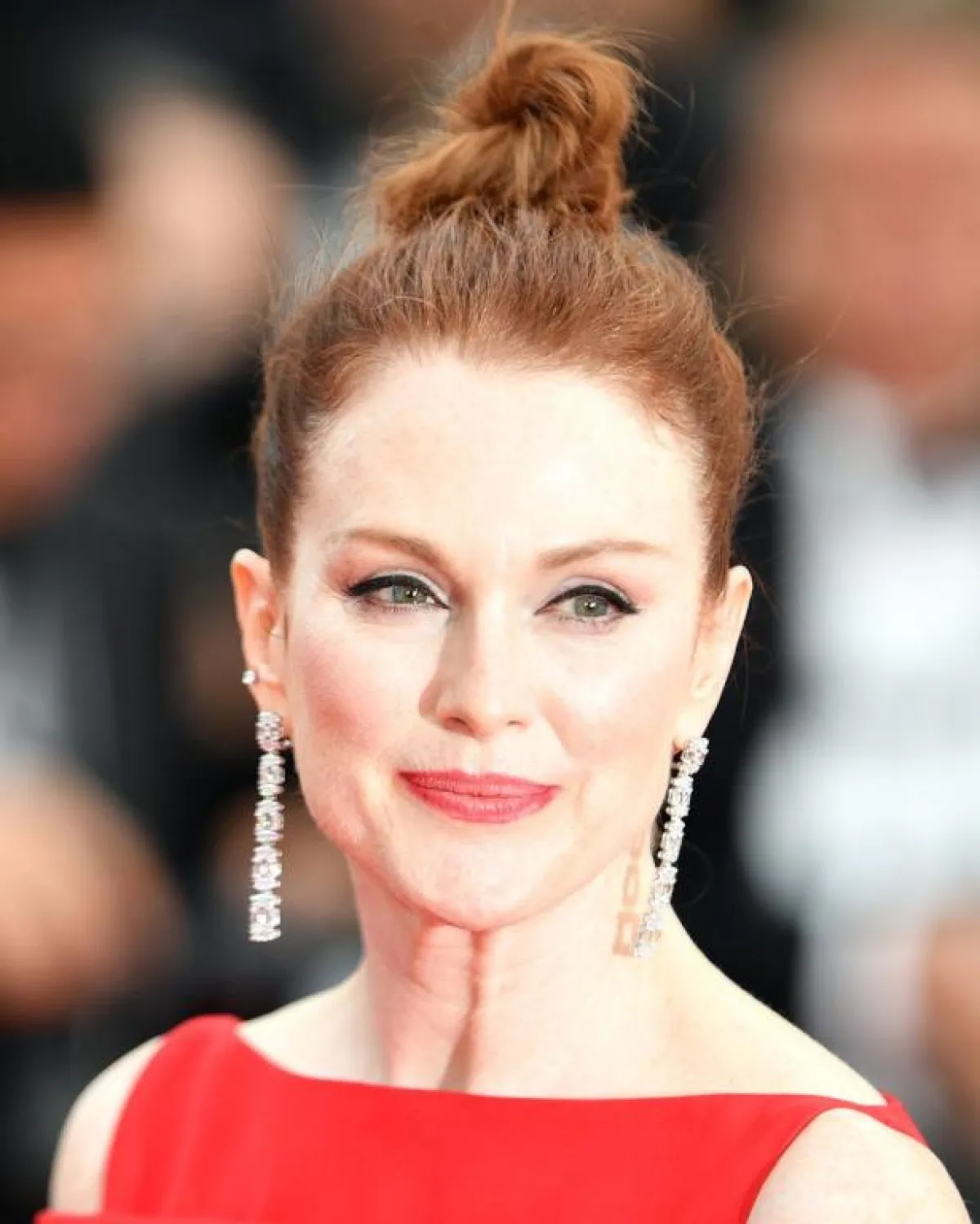 النجمة جوليان مور اختارت رسمة العين الناعمة التي تعتمد على تحديد الجفن العلوي بـ الـ ايلاينر الأسود. وفي المقابل، اعتمدت أحمر الشفاه باللون الأحمر، مع البلاش الوردي لإبراز وجنتيها. كذلك، اعتمدت تسريحة الكعكة العفوية العالية.