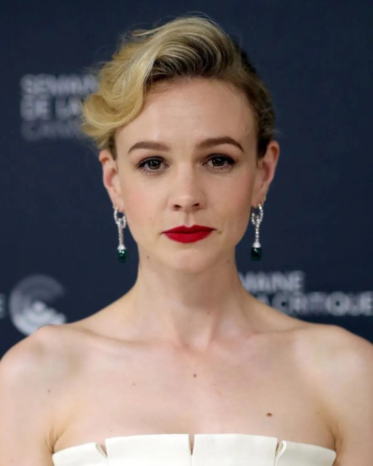 ظهرت النجمة Carey Mulligan بـمكياج ناعم لناحية العيون، حيث اختارت الكحل الأسود الناعم لتحديد الجفون العليا، وظلال العيون الخفيفة. إلا أنها اعتمدت أحمر الشفاه باللون الأحمر القوي، والبلاش الوردي لإضاءة سحنتها. وبالنسبة الى تسريحة الشعر، فاختارت تسريحة الكعكة المتوسطة مع الغرة الجانبية.