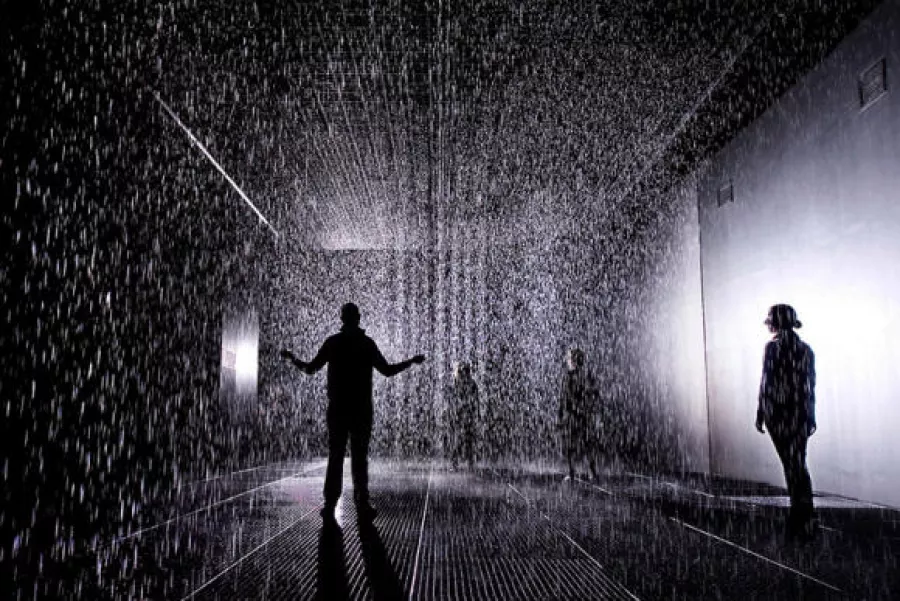 حقق محبو السير تحت المطر رغبتهم بدون مظلات تقيهم البلل وذلك في إحدى غرف "متحف الفنون الحديثة"، MoMA، بمدينة نيويورك، حيث قامت مجموعة من المصممين والفنانين، تعرف باسم "راندوم أنترناشيونال"، بتجهيز مساحة تبلغ 100 متر مربع، مغطاة بشبكة أنابيب تضخ ألف ليتر من المياه في الدقيقة، على شكل أمطار، ومزودة بأجهزة استشعار تتحسس الأشخاص السائرين تحتها وتمنع هطول الأمطار عليهم في جوٍ يحاكي الواقع.