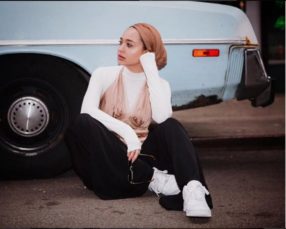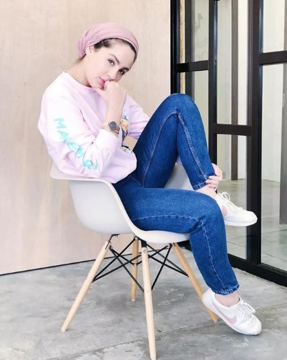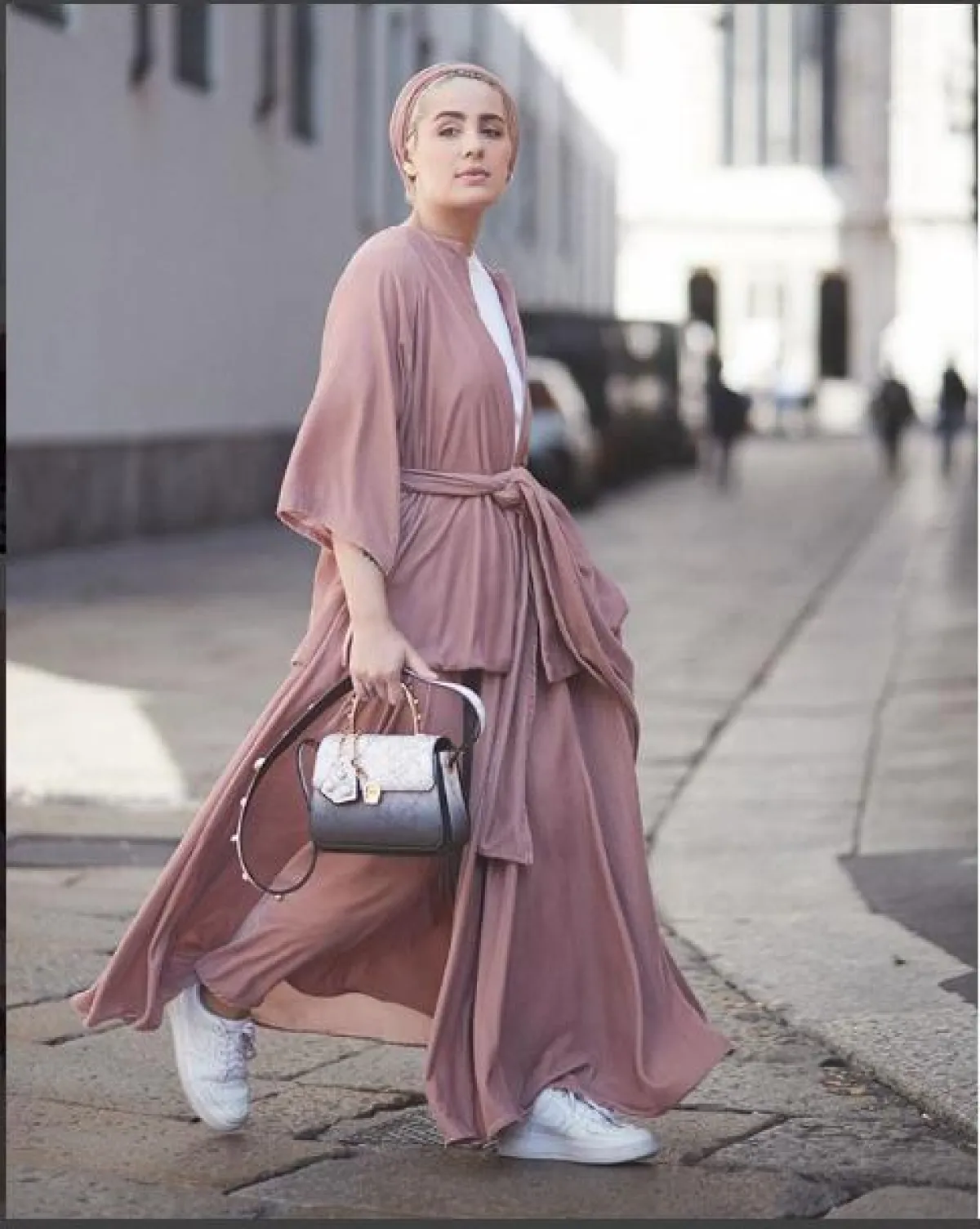 في مفهوم الفاشنيستا آسيا كل شيء ممكن ومتاح، فقد استطاعت تنسيق السنيكرز الأبيض مع العباية الشيفون، بإطلالة انسيابية بـ ألوان الباستيل الناعمة، مع التوربان العصري باللون الروز من نفس لون العباية.