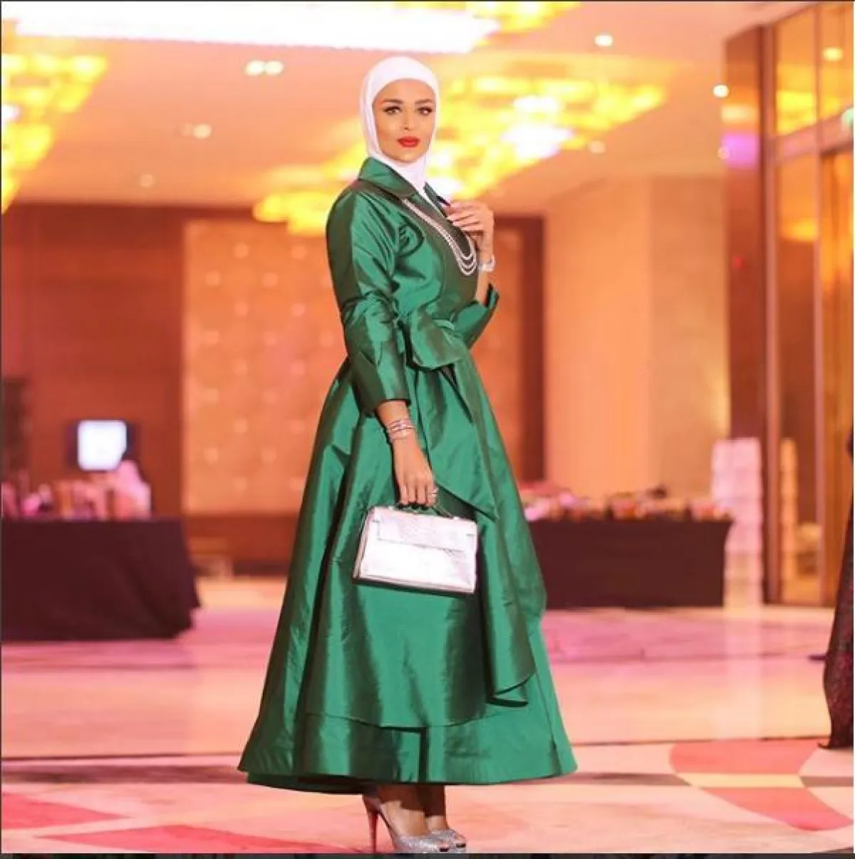 الفساتين الطويلة من ناحية الساق و الأكمام، بخامة الستان اللامعة والألوان المبهجة مثل هذا الأخضر المُنعش من مدونة الموضة مرمر محمد، والذي يعتبر من خياراتها المُفضلة، وتنسيقه مع حذاء وكلتش فضي اللون، لإطلالة تنبض جاذبية.