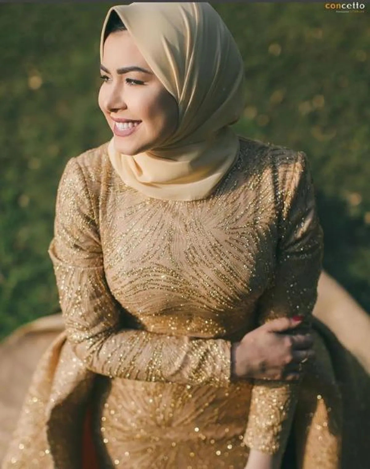 الفساتين المُطرزة بالكامل بفروع الشجر يمكنكِ اختيارها لـ إطلالة لافتة وجذابة لتكوني أنتِ نجمة الحفل على طريقة الفاشنيستا مروة حسن بالفستان الذهبي مع التطريزات باللون نفسه.
