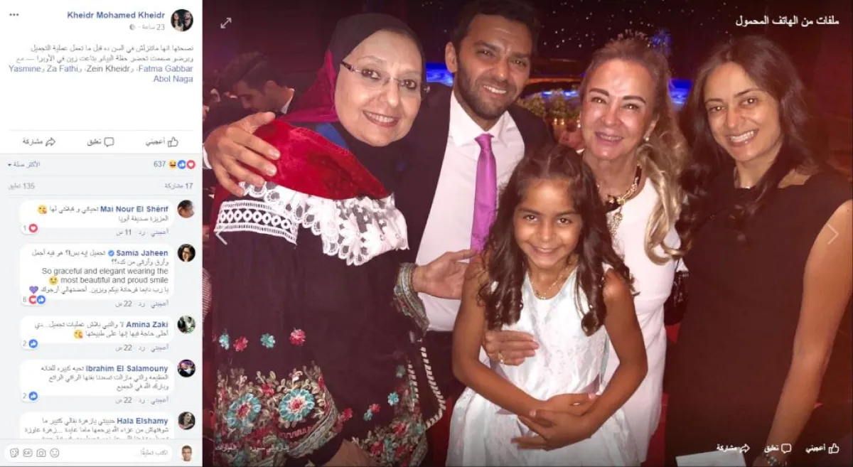 المخرج خضر محمد خضر، شارك متابعيه عبر صفحته الخاصة على موقع الفيس بوك، صورة حديثة للفنانة نجلاء فتحي، خلال مشاركتها في حفل حفيدتها بدار الأوبرا، وعلق على الصورة ساخراً: "نصحتها إنها ما تنزلش في السن ده قبل ما تعمل عملية التجميل وبرضو صممت تحضر حفل البيانو بتاع زين في الأوبرا".
