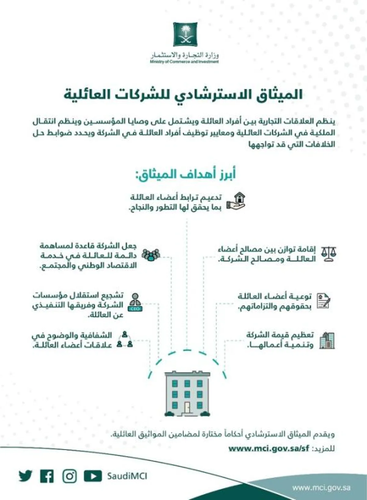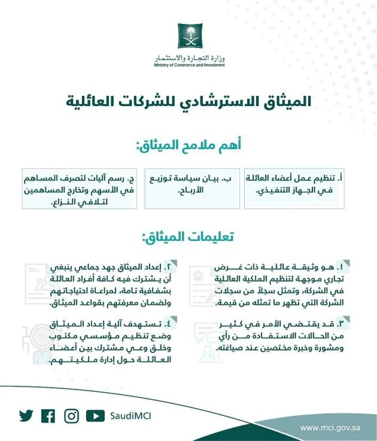 أصدرت وزارة التجارة والاستثمار الميثاق الاسترشادي للشركات العائلية السعودية بهدف تعزيز قيم العائلة التجارية، وتحقيق أهداف الشركات، وتنمية أعمالها وفق إطار مؤسسي، يدعم إمكانية توسعها وزيادة فرص نجاحها.