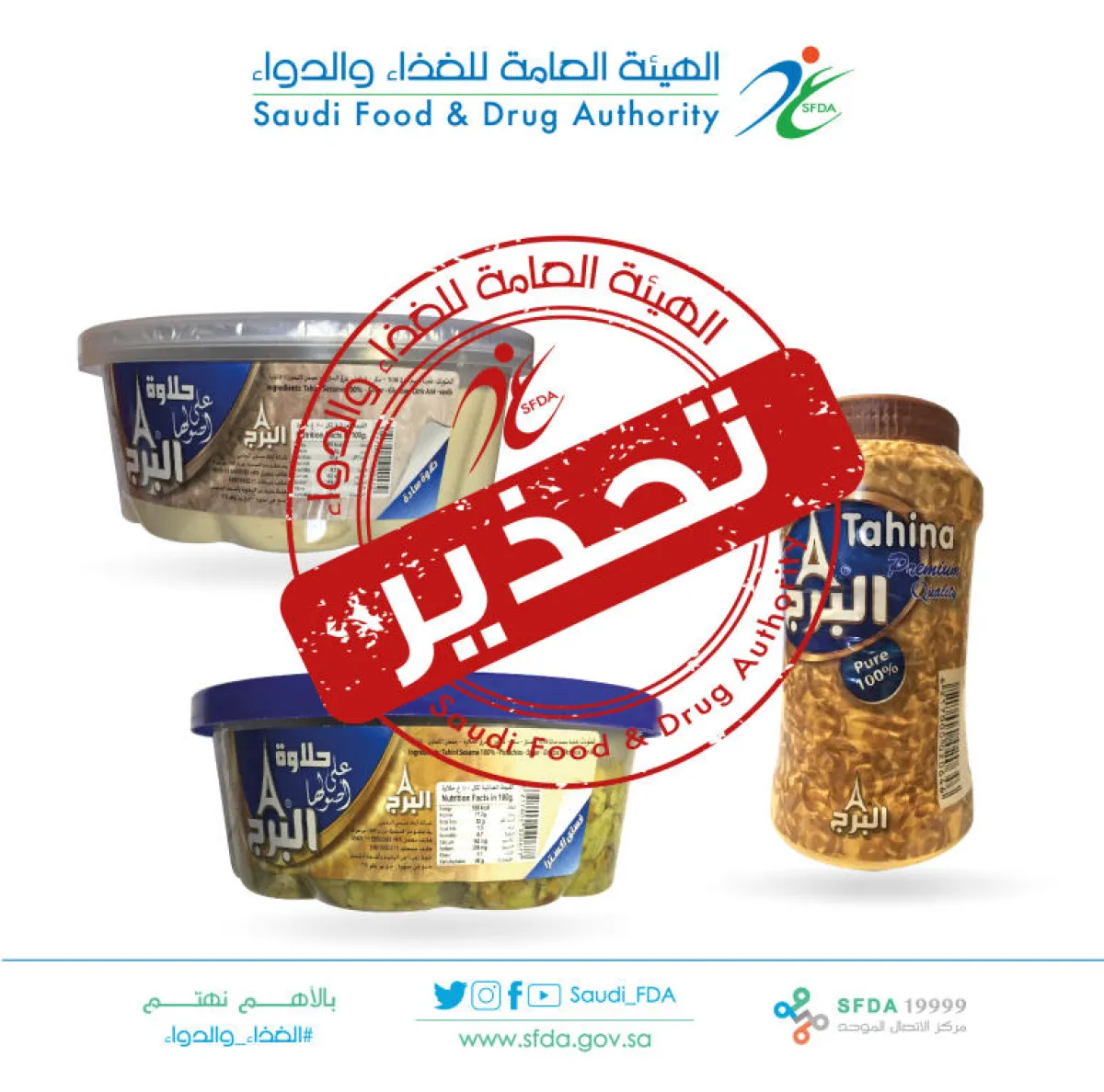 حفاظًا على صحة المستهلكين، حذّرت الهيئة العامة للغذاء والدواء من شراء أو استهلاك منتج طحينة ومنتج حلاوة للعلامة التجارية «البرج»، من إنتاج الجمهورية العربية السورية.