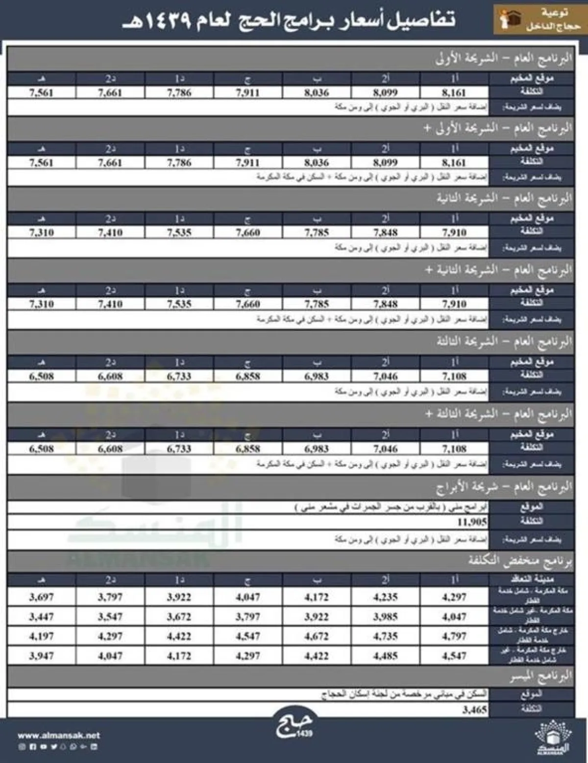 وللحجاج من خارج مكة: فئة (أ1) 4547 ريالاً، فئة (أ2) 4485، فئة (ب) 4422، فئة (ج) 4297، فئة (د1) 4172، فئة (د2) 4047، ولفئة (هـ) 3947 ريالاً، على أن يضاف إلى جميع أسعار الفئات المذكورة مبلغ 250 ريالاً في حالة كانت الخدمة مشمولة بالنقل في القطار.