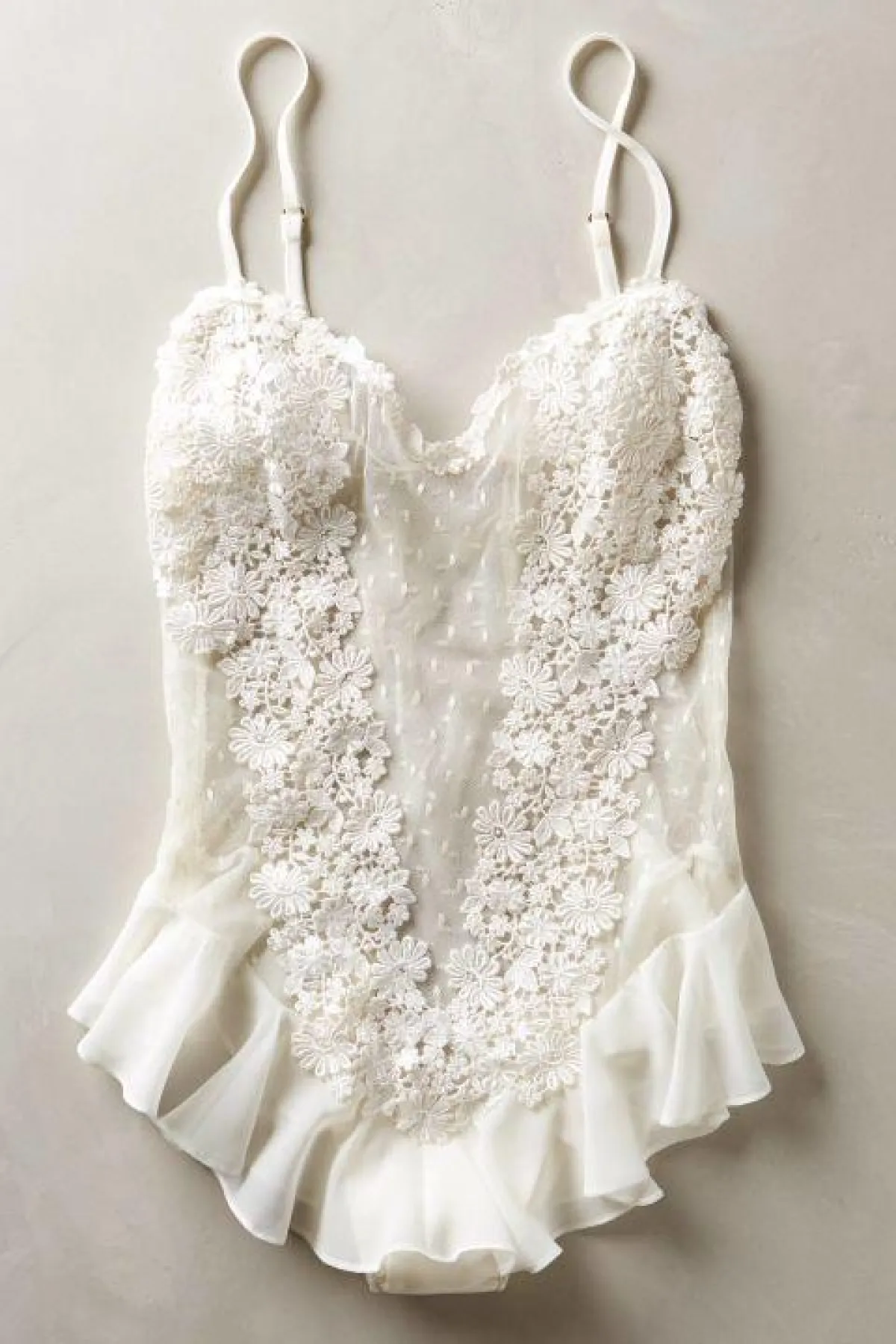 اختاري البيجامة الستان الناعمة أيضًا بألوان البيج والأبيض الفاتح، مع تفاصيل صغيرة بأن يكون البنطلون شفافًا بخامة الدانتيل، مع كشاكش التول الأنثوية من ناحية الصدر.