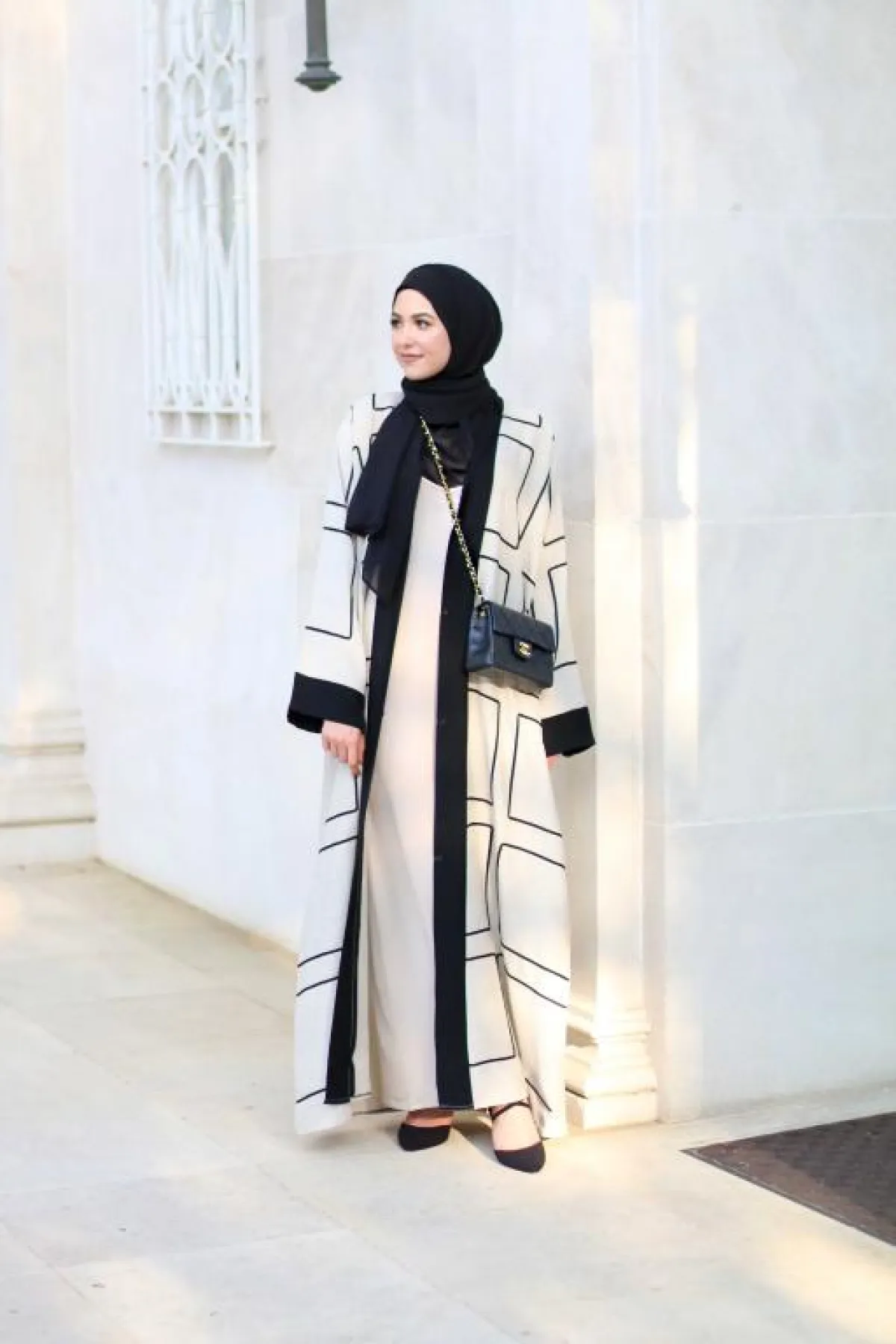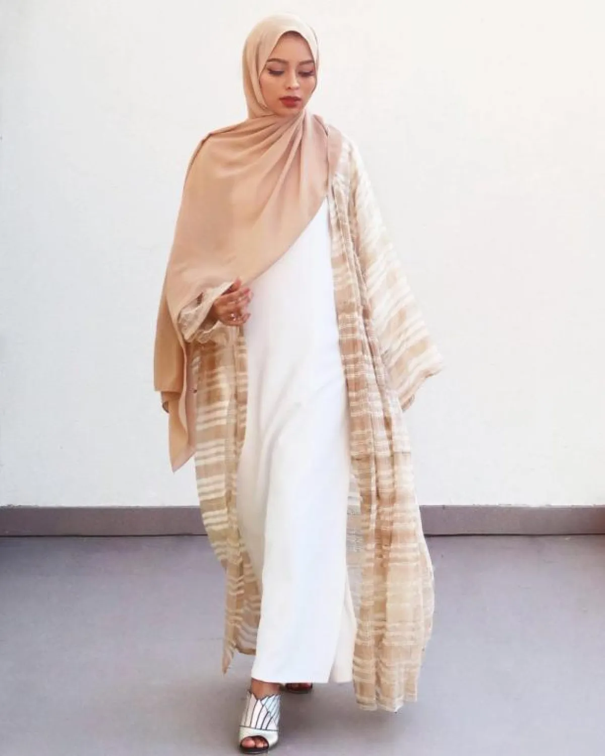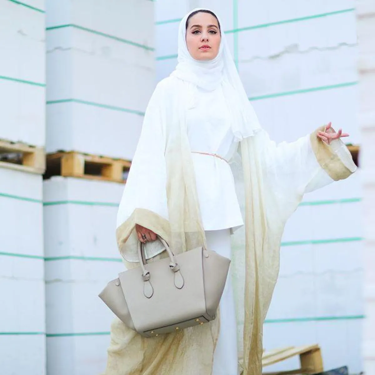 ظهرت العديد من الفاشينيستا بعبايات تجمع بين الأبيض والبيج، تلك الألوان الرقيقة تساعد في تحسين حالتك المزاجية عند ارتدائها.