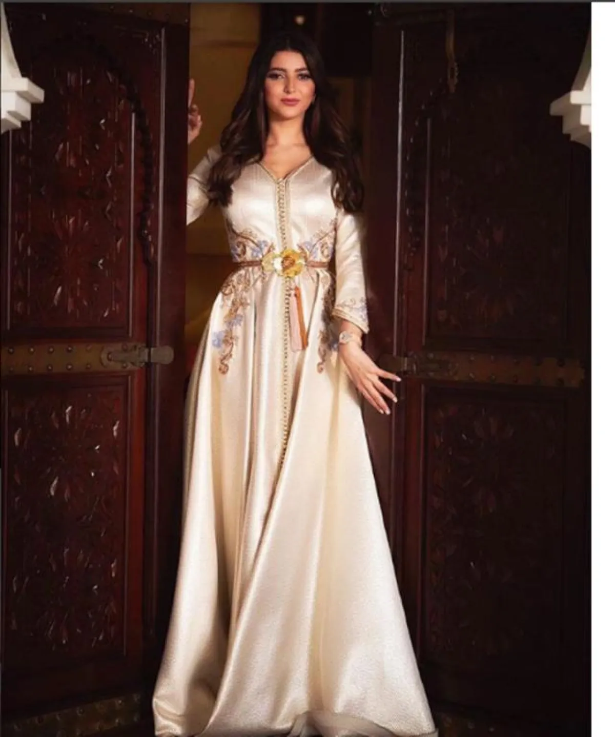 ألوان الكريمي والأوف وايت لا غنًى عنها في تصاميم القفطان، بإمكانكِ اعتمادها بالعودة للشكل التقليدي الفخم للقفطان، مثل اختيار الإعلامية مريم سعيد، أو مقدمة البرامج أسمهان النقابي.