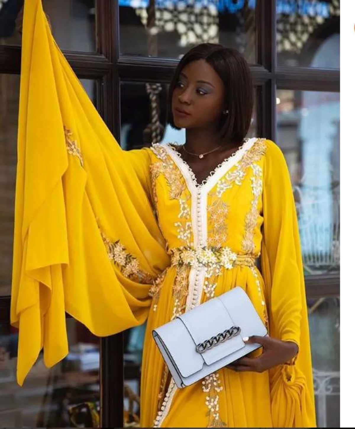 يمكنكِ اختيار لون الأصفر المشرق الناصع، الرائج هذا العام، بـ تصميم القفطان الفخم المرصع بالأحجار، والذي قد يناسب جدًّا الصبية صاحبة البشرة الخمرية أو السمراء، وإذا كنتِ محجبة اعتمدي معه طرحة باللون الأبيض، مع مكياج برونزي يُبرز جمالكِ، مثل تصاميم Palaisdesargano سارة محمد .