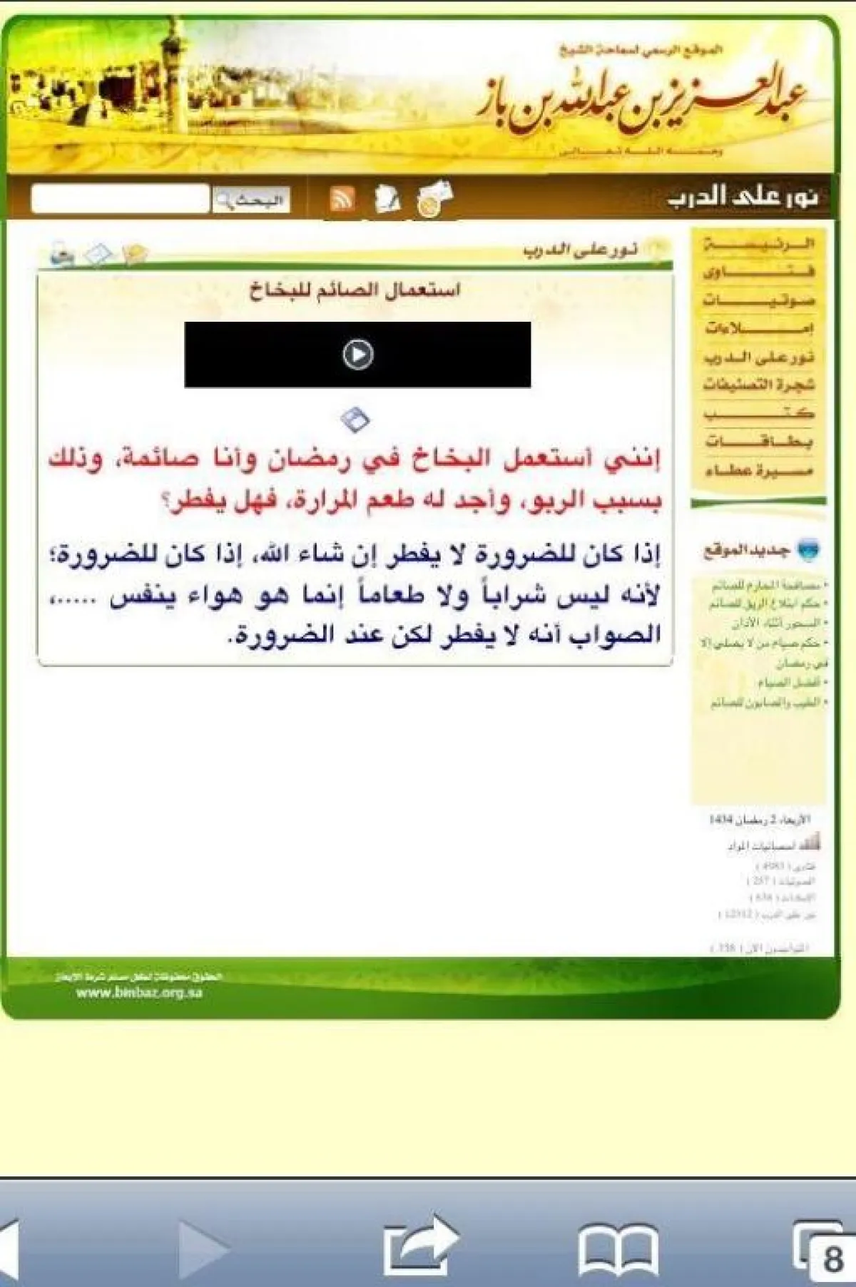 وحسب فتوى قديمة للشيخ عبدالعزيز بن عبدالله بن باز، رحمه الله، فإن بخاخ الربو إذا كان للضرورة لا يفطر، إن شاء الله، لأنه ليس شراباً، أو طعاماً وإنما هواء يتنفس.