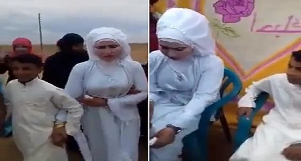 وأظهر مقطع فيديو، انتشر عبر مواقع التواصل، العروسيْن وهما يتوجهان نحو كوشة بسيطة من المقاعد البلاستيكية، وسط زغاريد وتصفيق من الحاضرات، وإطلاق للأعيرة النارية، ويتبين من خلال المقطع أن العريس «الطفل» لم يكن سعيدًا.