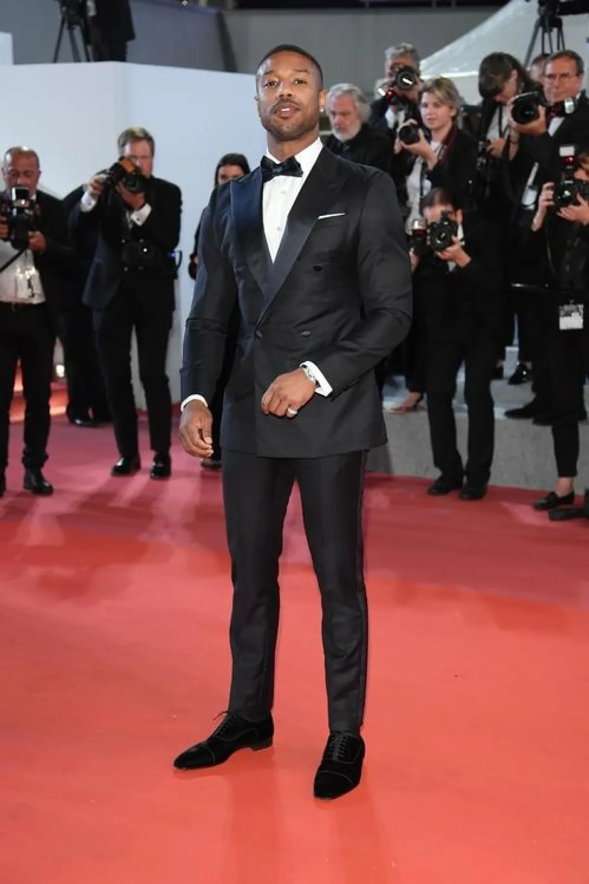 ظهر النجم العالمي Michael B. Jordan مايكل ب. جوردون يوم افتتاح مهرجان كان السينمائي 2018 ببدلة أنيقة عبارة عن tuxedo توكسيدو ضيق من ناحية الصدر ليبرز عضلات مايكل، مع ربطة عنق الفيونكة باللون الكحلي الداكن اللامع بخامة الستان ، من دار الأزياء العالمية جورجيو آرماني Giorgio Armani.